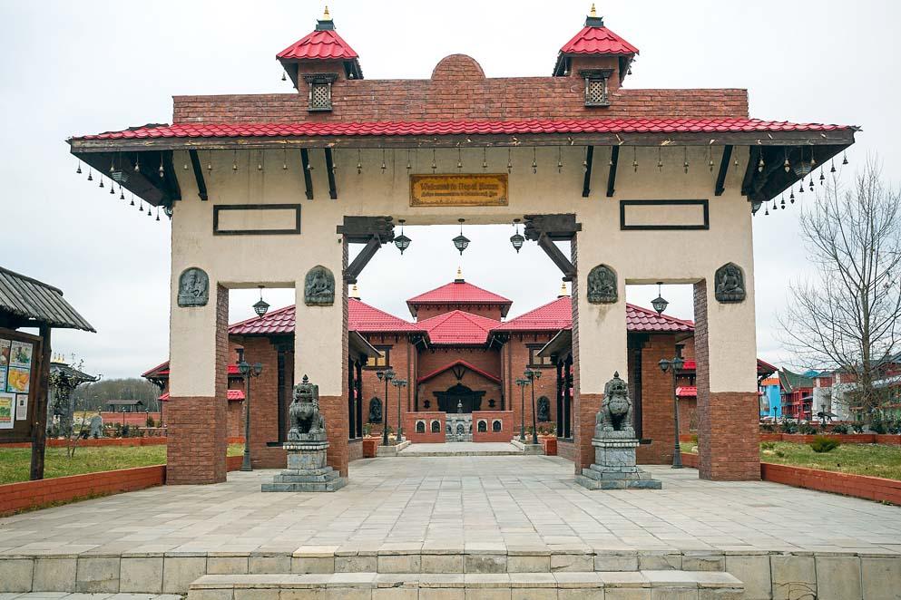Открывает музей-парк этнодвор, посвященный Азии, и дом Шри-Ланки (на фото внизу), построенный в традициях ланкийской культуры. Огромный лев охраняет здание, рассказывая посетителям легенду о скале Сигирия, на вершине которой располагалась целое царство. Чтобы подняться на нее, надо было быть очень отважным и смелым – войти в пасть льва. Оригинальная статуя на Шри-Ланке до наших дней не сохранилась, от льва остались только лапы. Архитекторы Этномира полностью их воссоздали и пофантазировали, как мог бы выглядеть сам лев.