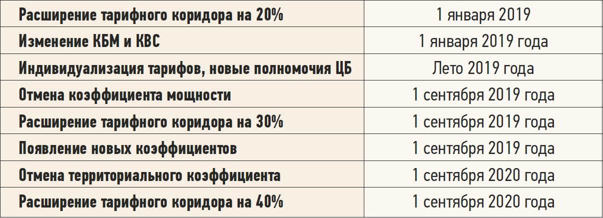 Изменения в законе нужны для реализации второго этапа реформы «автогражданки». Первый этап будет осуществляться без изменения закона об ОСАГО – чтобы выполнить все задуманное, достаточно решений Центробанка как мегарегулятора страхового рынка. Напомним, начальный этап реформы, о котором мы рассказывали в «АвтоМире» №41, 2018 подразумевает расширение тарифного коридора на 20%, изменение системы расчета коэффициентов «возраст-стаж» и «бонус-малус». Если в ноябре Центробанк утвердит первый этап реформы, то новый тарифный коридор и коэффициенты начнут действовать с 1 января 2019 г.