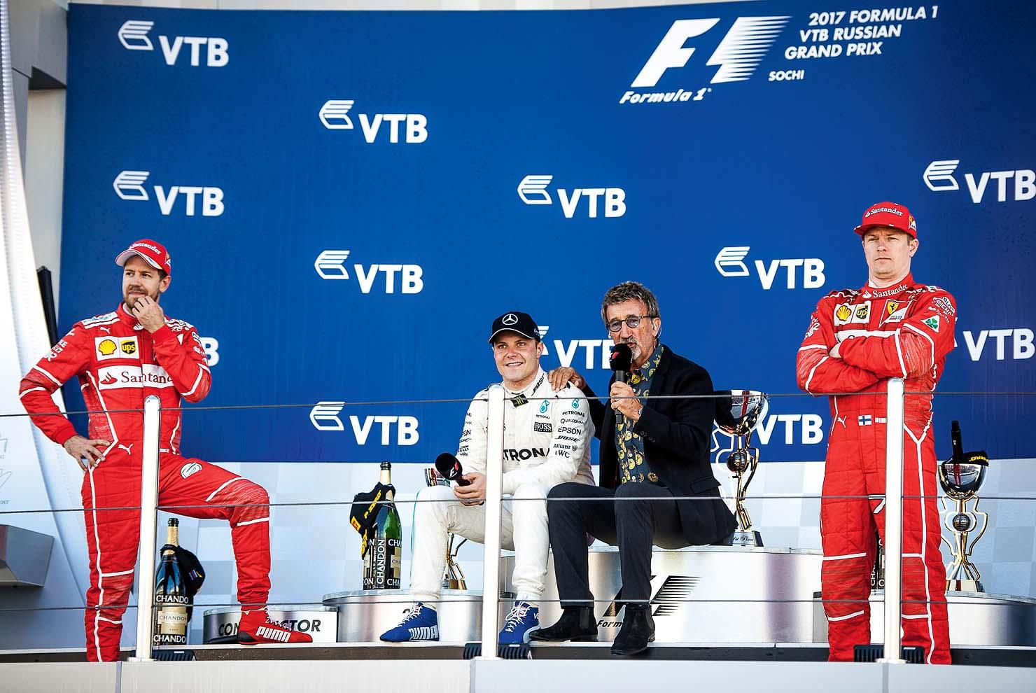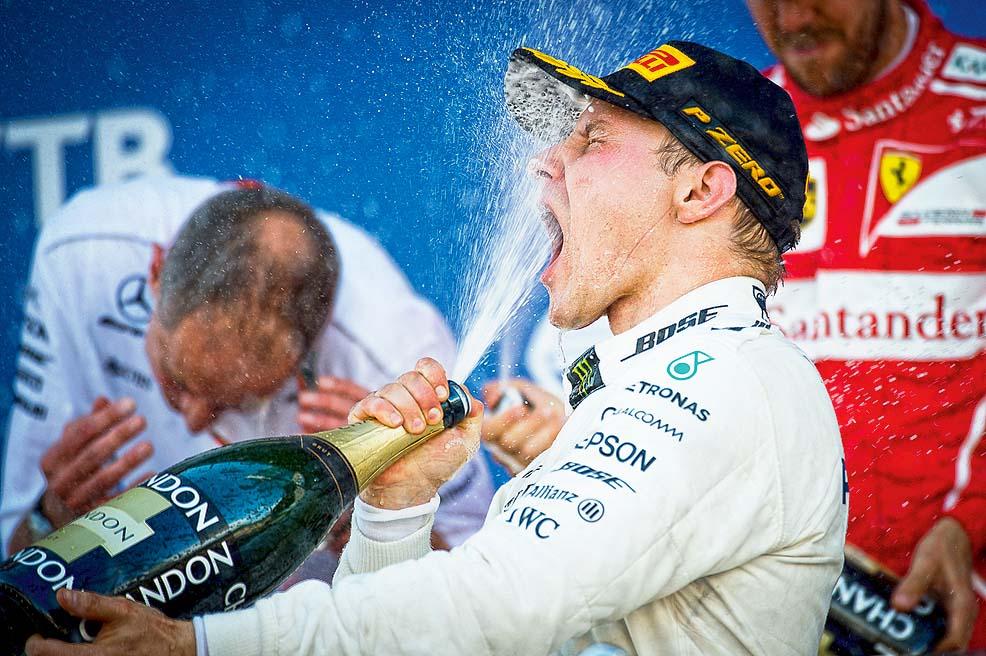 Вот они, победители этапа в Сочи. Пока счастливый Валттери Боттас, впервые выигравший Гран При, делится впечатлениями о гонке, Себастьян Феттель выглядит тоже вполне довольным, а вот Кими Райкконен очевидно мрачен. И это не минутная слабость