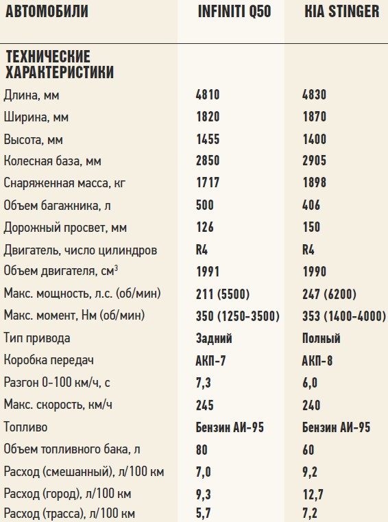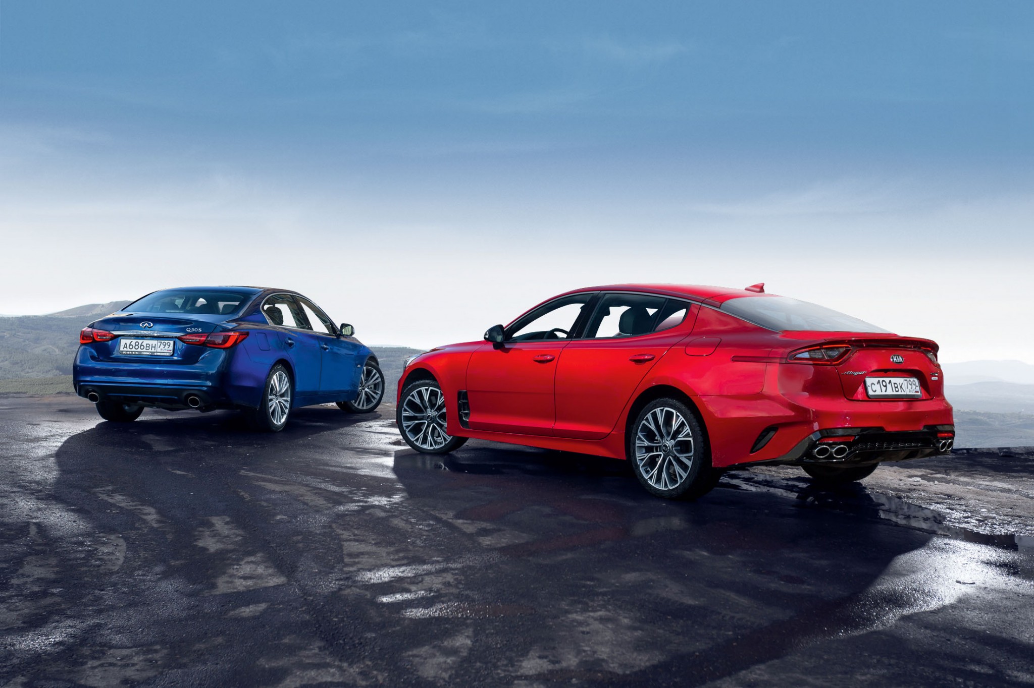 Сразу скажем: большая разница в цене тестовых автомобилей обусловлена тем, что наш Infiniti в заднеприводной версии, а Kia – с полным приводом и в самом дорогом для 2,0-литрового мотора исполнении GT Line. При этом Stinger c задним приводом и в версии попроще стоит куда меньше – от 1 999 900. Но и базовый Q50 обойдется дешевле – в 1 725 000 рублей. У обеих моделей есть более мощные и быстрые версии. Infiniti Q50 – с мотором 3.0, который выдает 405 л.с., этот седан достигает 100 км/ч за 5,4 с. А вот Stinger GT с 3,3-литровым двигателем мощностью 370 л.с. динамичнее – 4,9 с до «сотни».