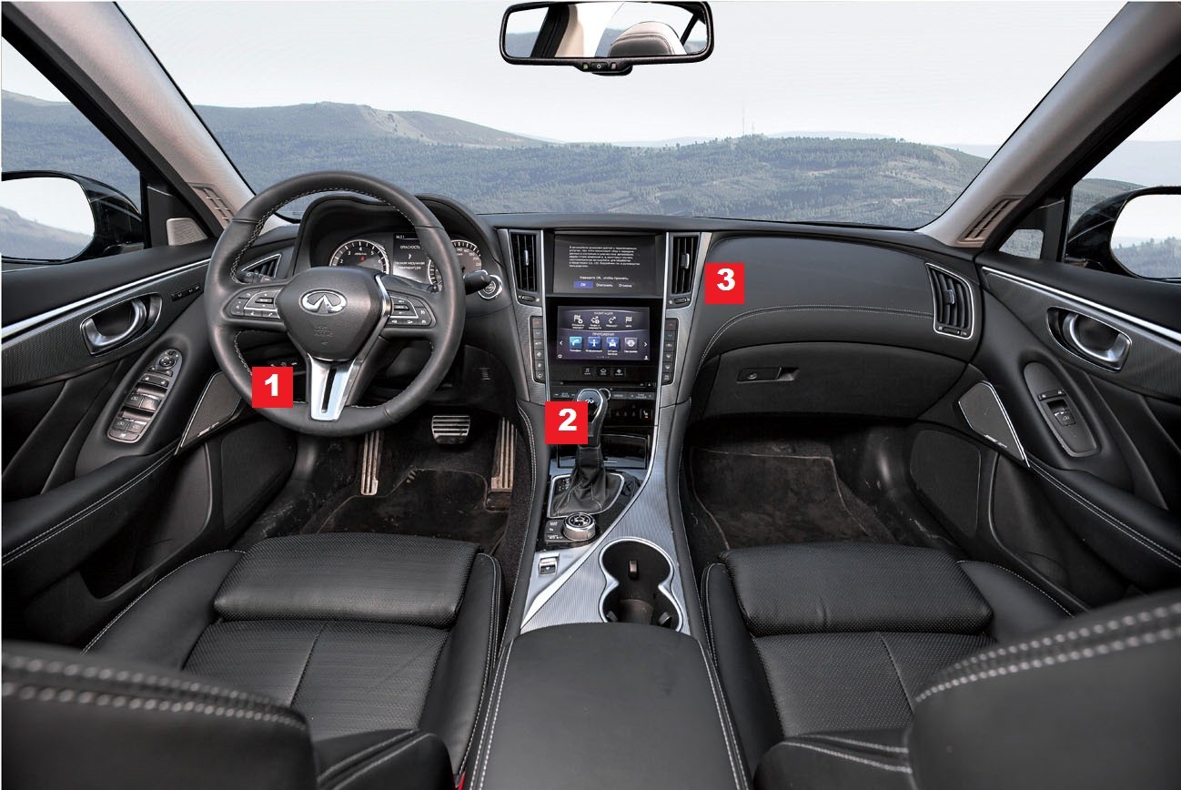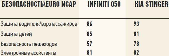 Комфортабельность у обоих автомобилей примерно на одном уровне, хотя для Infiniti в принципе доступен чуть меньший набор опций, чем для Kia. У Q50, например, вообще не может быть обогрева руля и задних сидений. У Stinger они есть, причем теплая «баранка» положена абсолютно всем версиям. Еще у Q50 как класс отсутствует беспроводная зарядка для телефона, предусмотренная почти во всех Stinger.