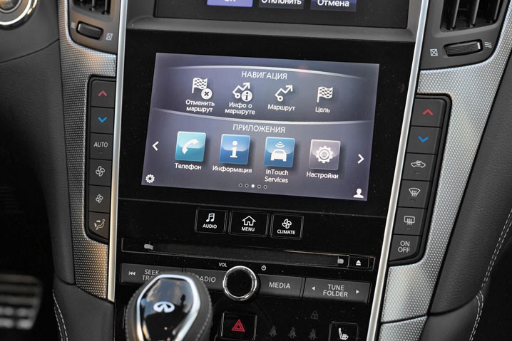 В салоне Q50 – сразу два больших дисплея на центральной консоли. На верхнем отображаются данные навигатора, внизу – управление всеми мультимедийными функциями. Неоднозначное решение