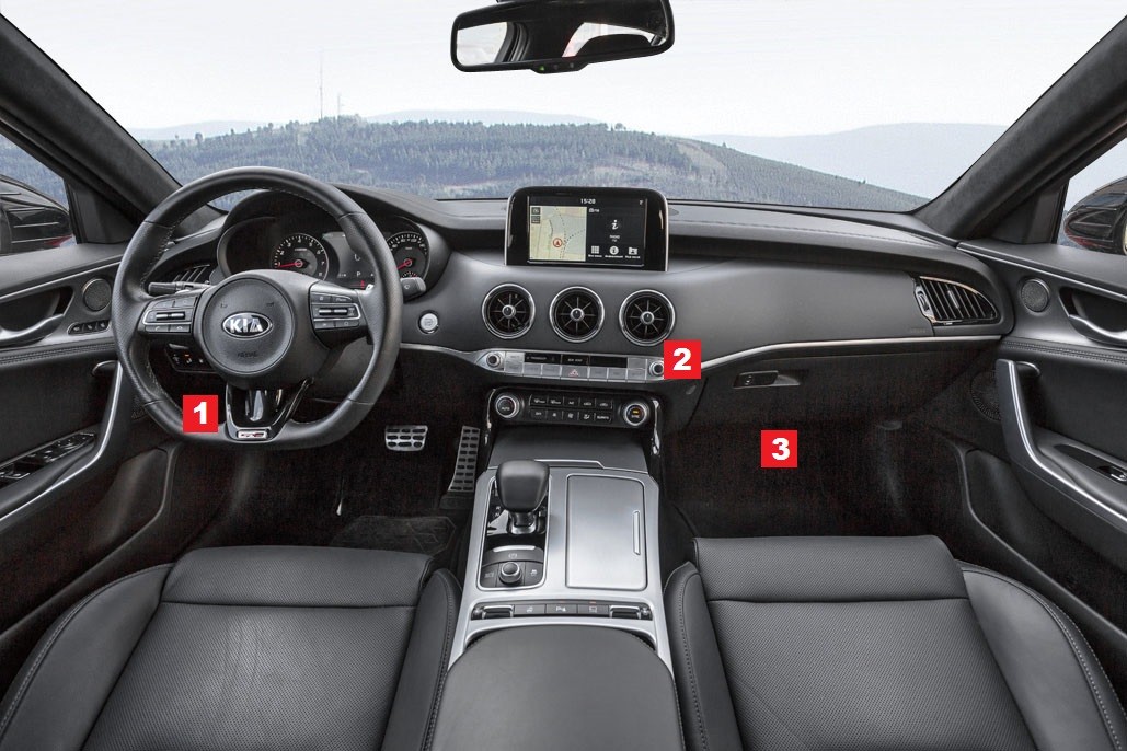 1. Начальная комплектация подразумевает отделку искусственной кожей, в нашей версии GT Line – натуральная 2. Дефлекторы вентиляционной системы сделаны в авиационном стиле 3. Пространство для ног не назвать особенно широким – сидеть развалившись в Stinger не получится из-за конструкции обшивки дверей и тоннеля