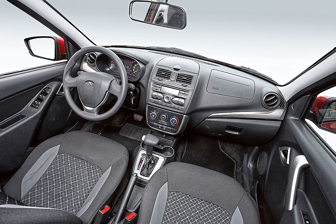 Удобно устроиться за рулем автомобиля в дорогой версии Luxe не проблема – здесь есть и регулировка водительского кресла по высоте, и электроприводы зеркал. Но на более доступных вариантах сиденье в вертикальной плоскости не перемещается, а с работой электроприводов вышла странность: пару раз машина самопроизвольно опускала правое зеркало в нижнее положение, а однажды ночью пыталась напугать отказом кнопок стеклоподъемника – да еще с открытым окном! Не испугался: вынул из двери блок кнопок, пошевелил провода – «глюки» ушли и больше не возвращались. К «железу» при этом претензий никаких – тандем бензинового 98-сильного мотора и АКП ведет себя четко и прогнозируемо. С упреждением нажимая педаль газа, можно эффективно ускоряться и пронырливо лавировать в городском потоке. Рулевое управление позволяет – если сравнивать с ранними экземплярами Granta, создается ощущение,что обратная связь стала несколько более внятной. Но выходить за ограничения скорости на магистралях себе дороже – АКП здесь 4-ступенчатая, поэтому неизбежен шум и рост расхода.