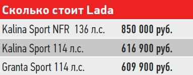 В оснащение входят климат-контроль, мультимедийная система, датчики света, дождя и парковки, но комфортной эту машину не назовешь. Характер у нее своенравный, вспыльчивый. В отличие от большинства современных горячих хэтчей, что дают тебе все и сразу и стараются везти по возможности мягонько, Kalina Sport NFR отрабатывает неровности жестковато и на низах тянет вяло. Но руль по умолчанию острый и точный, механизм переключения передач настроен аккуратно, и если не стесняться крутить мотор до отсечки, Lada «разгорается», затягивает тебя в гонку. Так бы и упражнялся часами, Было бы только место. А в закупоренном пробками городе с ней не интересно, да и не очень удобно. Для повседневного использования лучше подходят менее злые Granta и Kalina Sport. Энергии и у них хватает, но подвеска комфортнее, а цена ниже.