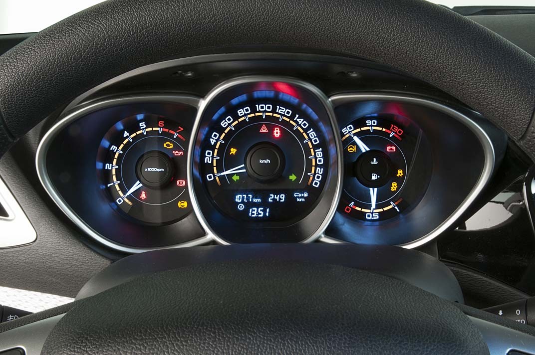 Приборной панели явно пытались придать оригинальности. Отчасти получилось. Если с формой колодцев, что называется, угадали, то с цветами все же переборщили. Информацию мешают воспринимать кучно расположенные цифры спидометра и отражения подсветки от ободков