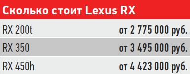 Стоит наш RX так же, как выглядит. Весомо, дерзко, премиально. Машину в версии Exclusive можно приобрести по цене от 4 869 000 рублей. За возможность получить цвет «искрящийся белый специальный» добавьте еще 114 000 рублей. И еще 97 000 за пакет опций City Style. Вот вам искомые пять с лишним миллионов. Зато за 20-дюймовые колеса и коричневой кожи салон доплачивать не придется. Все включено.