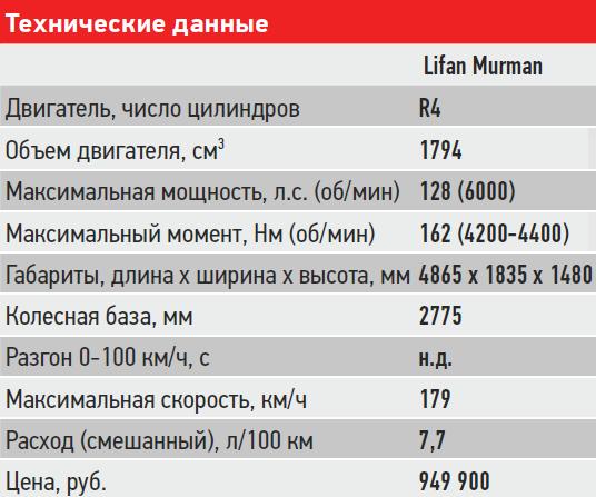 Пока что на российском рынке Lifan Murman доступен с единственным бензиновым мотором объемом 1,8 л, мощность которого составляет 128 л.с. В паре с ним трудится 5-ступенчатая механическая коробка передач. Автомат, говорят в компании, начнут устанавливать, как только получат обратную связь от покупателей, которые и определят, нужен ли он «Мурману». Позже на конвейер завода Derways где выпускаются «Лифаны», предназначенные для российского рынка, обещают поставить и версию с 2,4-литровым двигателем, мощностью 161 л.с., и вариатором.
