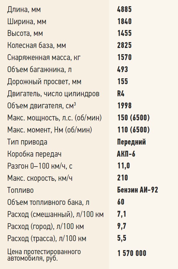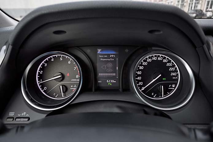 В сравнении с более дорогими версиями тестовый седан в комплектации «Классик» проигрывает несильно. Разница в мощности между моторами 2.0 (150 л.с.) и 2.5 (181 л.с.) приличная, 31 «лошадь». Однако по ощущениям 2,0-литровая машина едет ничуть не хуже. Да и по документам отличие во времени при спурте с места до 100 км/ч – всего 1,1 с. Особняком стоит топовая версия с 3.5 под капотом (249 л.с.), но мотор здесь скорее подчеркивает статус покупателя самой дорогой Camry. Использовать возможности этого двигателя V6 в городе практически негде, все опутано сетью камер, да и аппетит у него соответствует объему – почти 9 л на 100 км. То ли дело «двушка» – скромные 7,1 л. Но главное – базовая Camry едет ощутимо мягче версии с мотором 2.5 за счет 16-дюймовых колес с «жирной» резиной 205/65. И при этом не уступает в плане управляемости старшим версиям. По оснащению есть заметные различия, но они не критичны – дисплеи помельче, да некоторые опции отсутствуют.