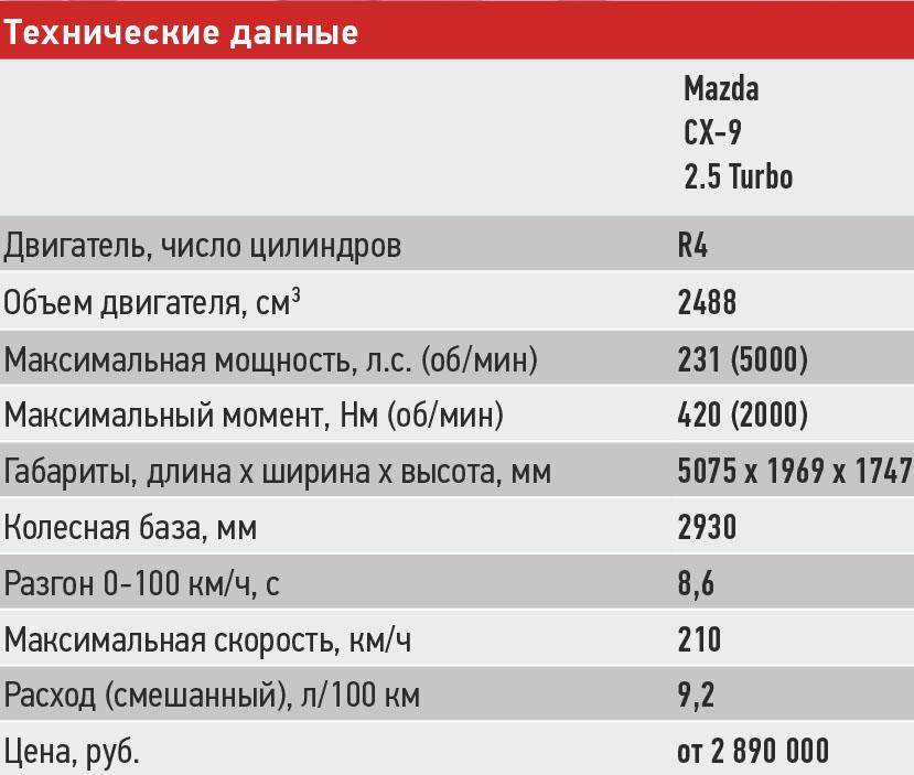 Сменив поколение, большая Mazda стала ловчее и азартнее. Крены кузова в поворотах и раскачка на продольных и диагональных волнах стали заметно меньше. Кроссовер мчит по прямой и нарезает повороты с непоколебимостью утюга, невзирая на колейность и боковые порывы ветра. Да, тяжелые 20-дюймовые колеса снижают плавность хода на крупных неровностях, но дорожную мелочь подвеска фильтрует исправно. И на руле четкая обратная связь. Так что отказ CX-9 от «фордовской» платформы CD3 и переход на свою собственную более чем оправдан. Мало того, и мотор теперь «родной» – 2,5-литровый SkyActive c турбонаддувом. И хотя заветные 260 км/ч для нее не достижимы, но в легитимных скоростных режимах Mazda совершает обгоны с завидной легкостью. Внушительные 420 Нм крутящего момента обеспечивают надежный запас тяги. Реальный расход топлива оказался хотя и выше заявленного, но и 12,5 л/100 км в смешанном режиме – похвальный результат для машины такой комплекции. К сожалению, в целом позитивную историю несколько портит высокая цена в районе трех миллионов рублей. С другой стороны, конкуренты просят за свои таланты ничуть не меньше.