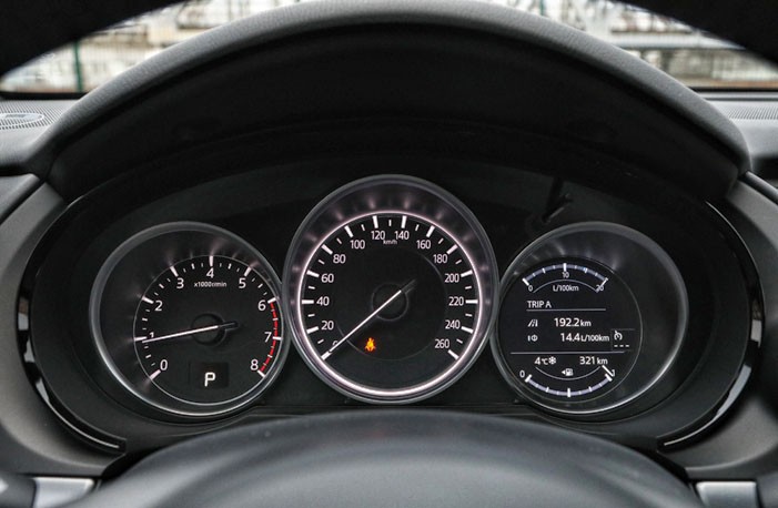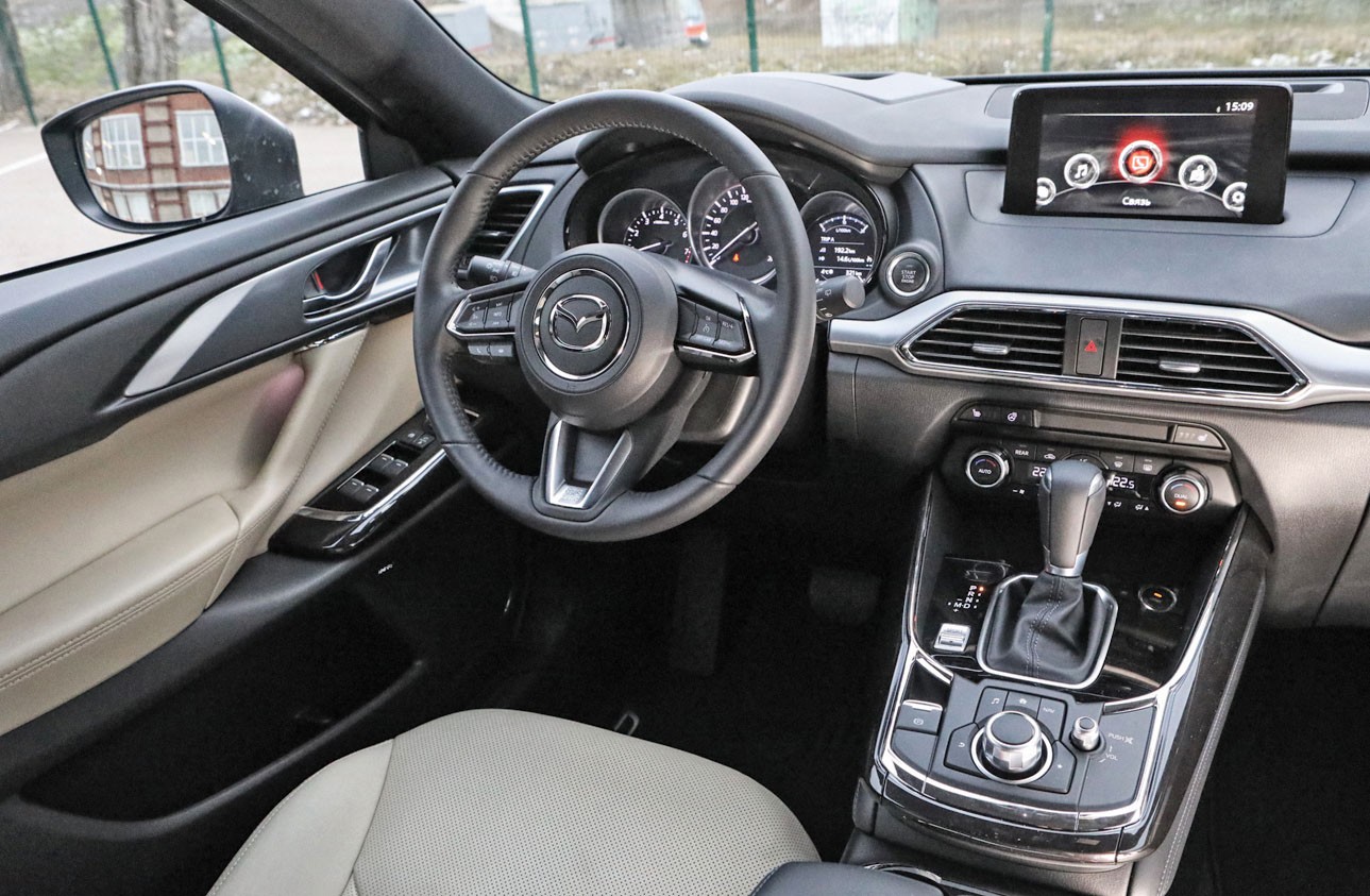 Начать надо с того, что будучи самым крупным 7-местным кроссовером в классе CX-9 умудряется выглядеть элегантно и, не побоюсь этого слова, спортивно. Этакая хищная рыбина, исполинские размеры которой реально осознаешь только подойдя к ней близко. На то, что имеешь дело не с заурядной многоместной повозкой, а с машиной, наделенной бойцовским характером, намекает и водительское место.