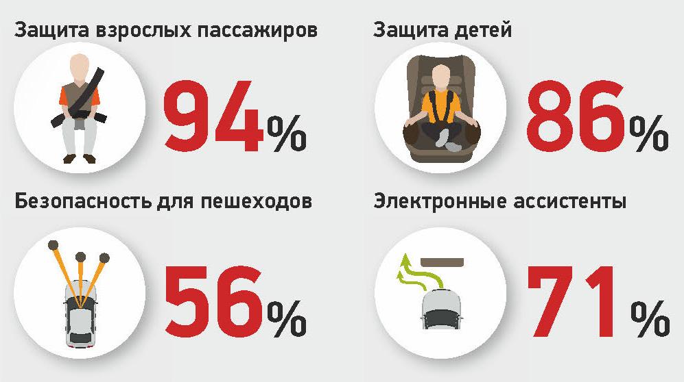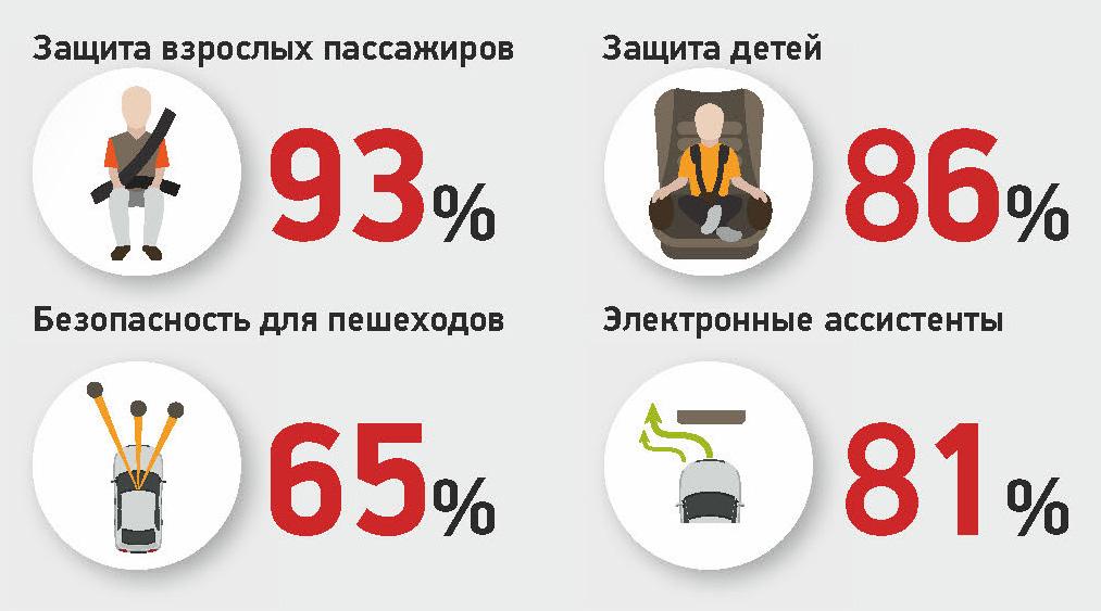 Volkswagen Jetta в тестах на безопасность Euro NCAP заработал максимальные пять звезд. Лучше всего немецкий седан выступил в дисциплине «Защита водителя и переднего пассажира», заработав 94% из ста возможных. Готов Volkswagen обеспечить и высокий уровень безопасности детей в случае столкновения. Чуть хуже показал себя автомобиль в категории «Электронные ассистенты» – всего 71 балл из ста. Специалисты Euro NCAP отмечают, что в базовое оснащение Jetta входит система предупреждения о непристегнутых ремнях водителя и переднего пассажира, но, что плохо, нет уведомления о превышении скорости. За защиту пешеходов Volkswagen набрал всего 56 баллов.