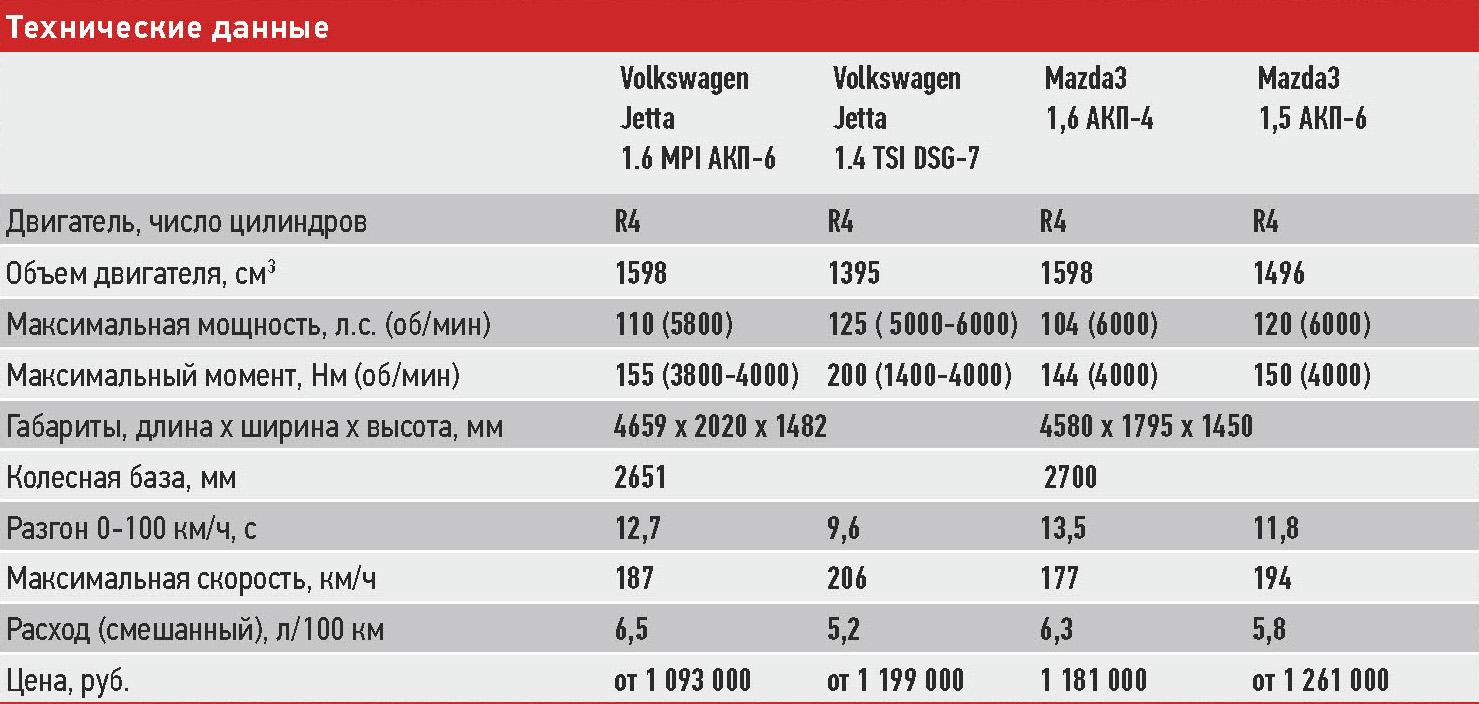 Пока едешь размеренно и степенно, кажется, что и по динамическим показателям Mazda и Volkswagen идентичны. Но стоит попытаться ехать чуть быстрее... И вот ведь парадокс! Шустрее-то оказывается «немец». Он на 5 л.с. мощнее, крутящий момент на 50 Нм больше, до «сотни» ускоряется на 2,2 с быстрее. Volkswagen Jetta охотнее набирает скорость при разгоне с места, готова смелее идти на опасный обгон на загородном шоссе. Неожиданно? Очень! Так что хватит навешивать ярлыки. Просто выбирайте автомобиль, внимательно изучив комплектации и технические характеристики, и, разумеется, прислушавшись к велению сердца.