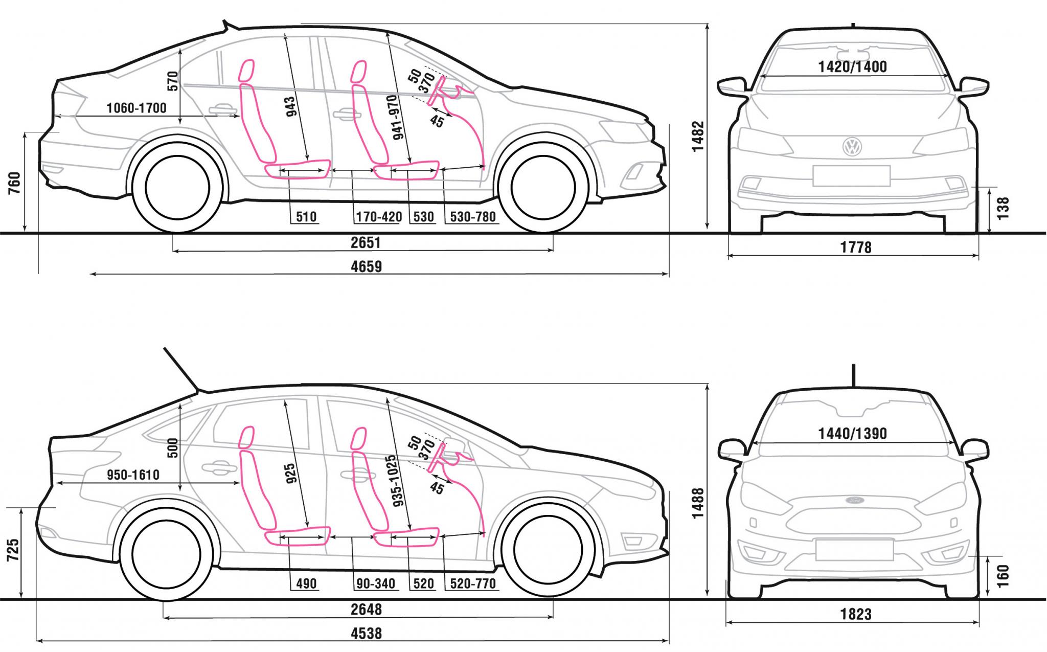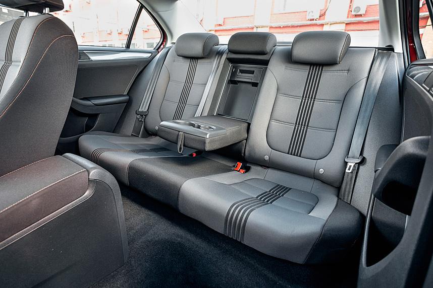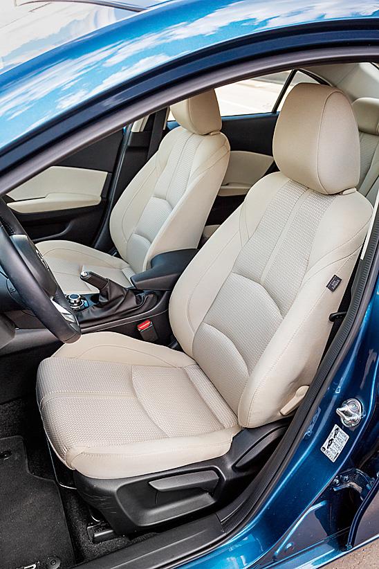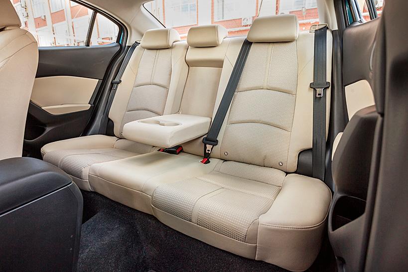 Даже на фоне «красочного» и стильного салона «Мазды» (кресла в «трешке» обиты выигрышным светло-бежевым материалом) расчерченные полосами сиденья Jetta смотрятся очень круто. Так что зачетах «дизайн», «качество материалов отделки» и «функционал» у седанов, бесспорно, паритет. Удобно в обоих автомобилях. Подход к организации рабочего пространства у «Мазды» и «Джетты» разный. Тем не менее, оба подошли к нему ответственно и не допустили ни одного серьезного промаха. Схожи седаны и по запасу свободного пространства, уготованного пассажирам. Задние диваны хоть и рассчитаны на троих, но все же двое смогут разместиться здесь с большим комфортом. А вот по запасу места в багажном отдели лидирует Jetta, у которой почти на 100 л больше полезного объема.