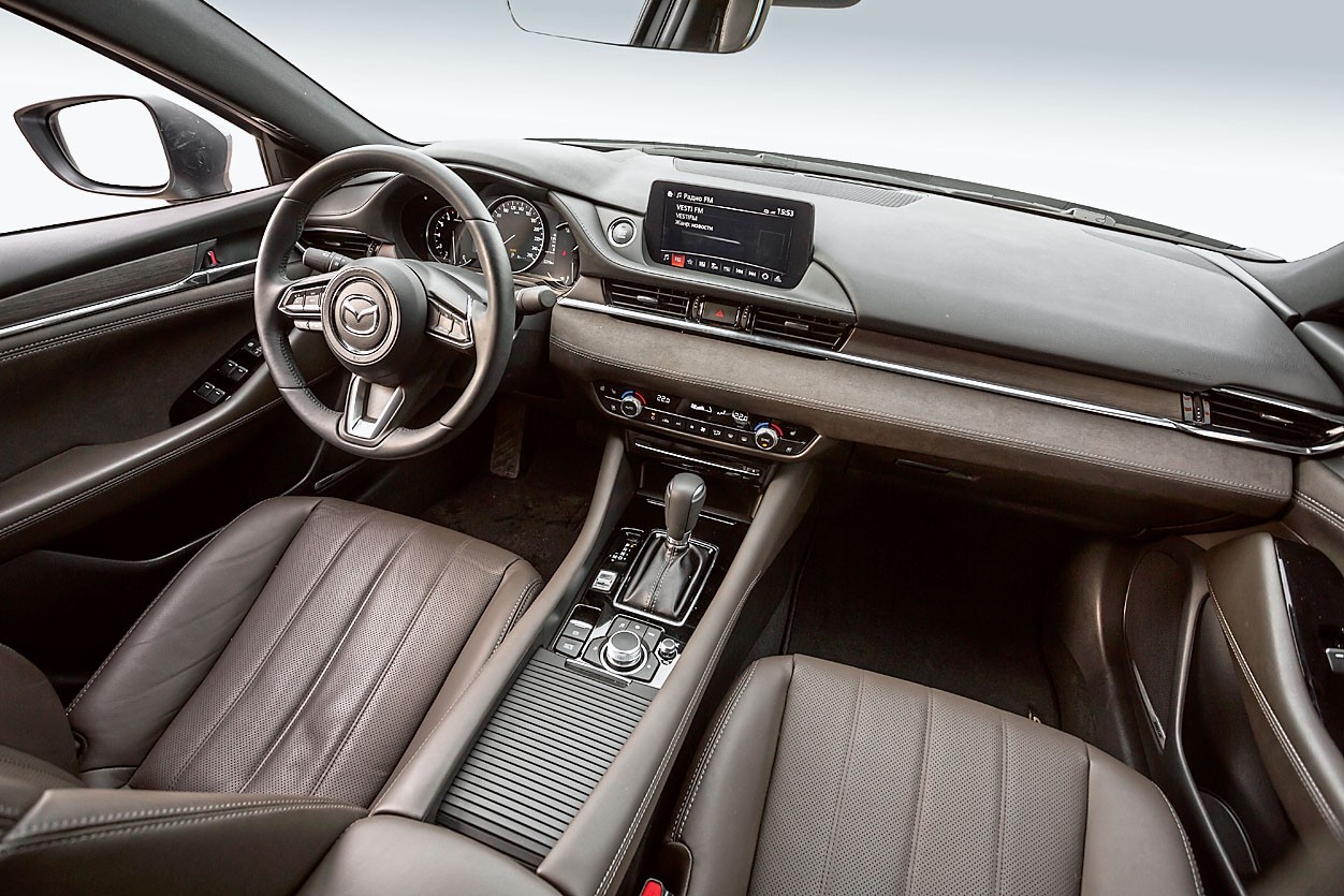 А вот в плане технологичности отделки особых амбиций «шестерка» не проявила. Удобство салона и эргономика похвальны, но убранство премиальным шиком не обескураживает. Быть может и к лучшему, поскольку топовая версия за 2 244 000 рублей – даже для «Мазды» многовато. А если заказать опцион из гаджетов безопасности (система безопасного торможения спереди и сзади, слежение за мертвыми зонами и разметкой, функция распознавания пешеходов), готовим дополнительные 111 100 рублей.