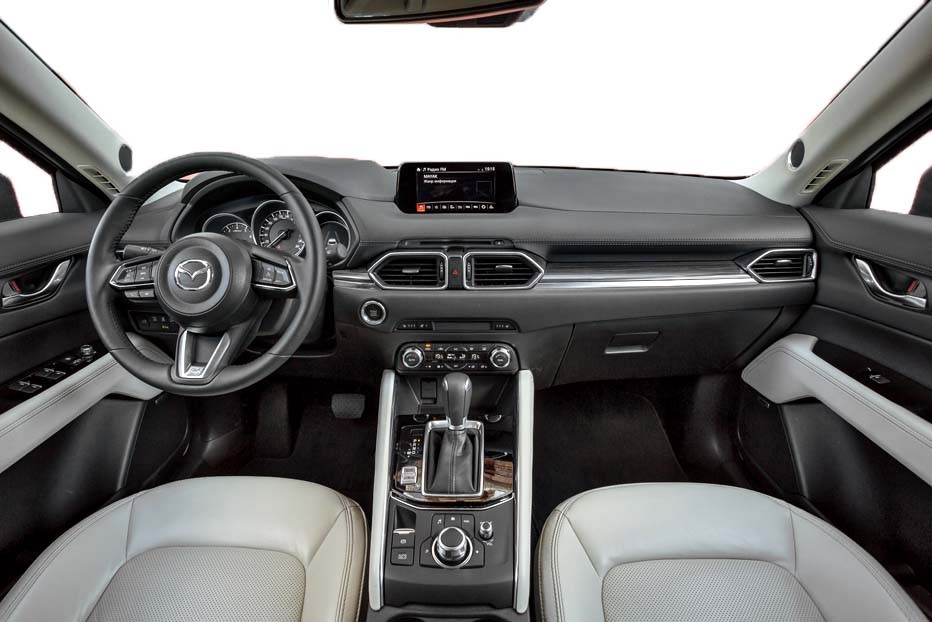Отделка «Мазды» выглядит самой дорогой и элегантной. Светлая кожаная обивка кресел хотя и проигрывает черной в практичности, несомненно добавляет салону лоска. Гармонично вписаны в интерьер и пластиковые вставки под дерево. При всем при этом полный порядок с эргономикой. Посему поздравляем СX-5 c еще одной победой.
