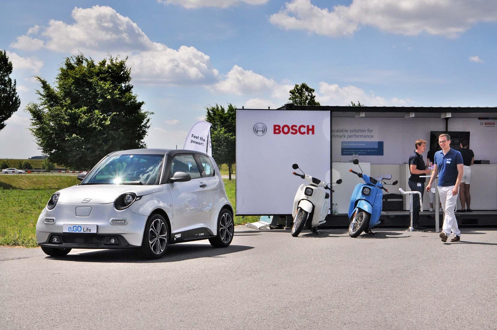 Четырехместная городская машинка e.GO и скутеры E-Schwalbe используют электрические моторы и 48-вольтные батареи Bosch