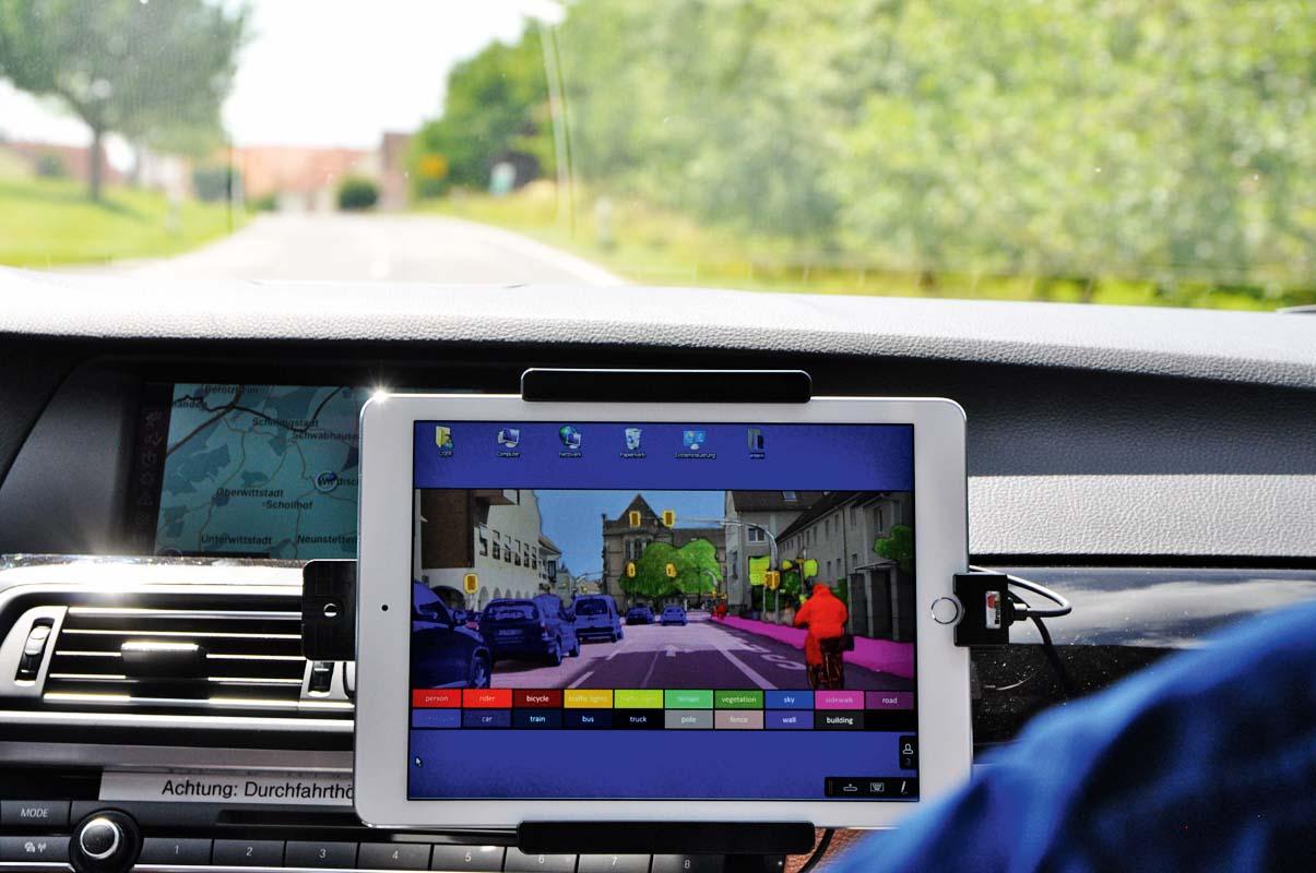 На экране планшета видно, как машины выглядят «в глазах» радаров автопилота