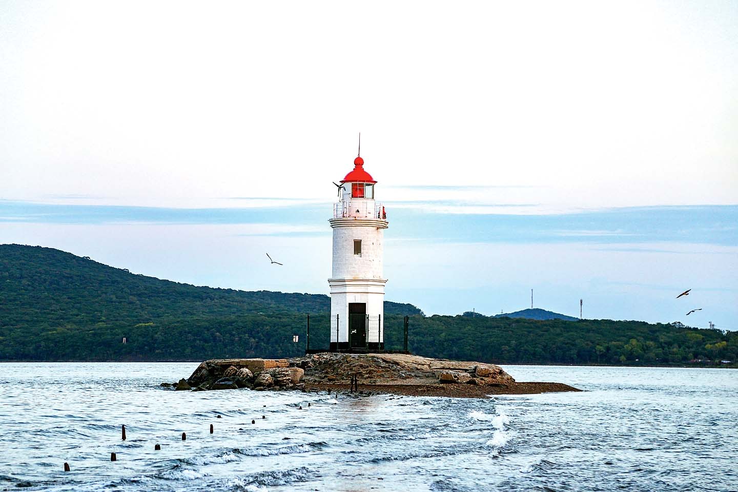 Следующее место обладает просто невероятной энергетикой и романтизмом – Токаревский маяк на мысе Эгершельд. Маяк расположен на оконечности узкой песчано-каменистой косы, выдающейся в море. Паркуете машину, а дальше пешком. Открывающиеся отсюда виды захватывают дух: слева возвышается остров Русский и одноименный мост, виднеется Владивостокский порт, а справа – неповторимой красоты море. Во время отлива можно дойти до самого здания маяка.