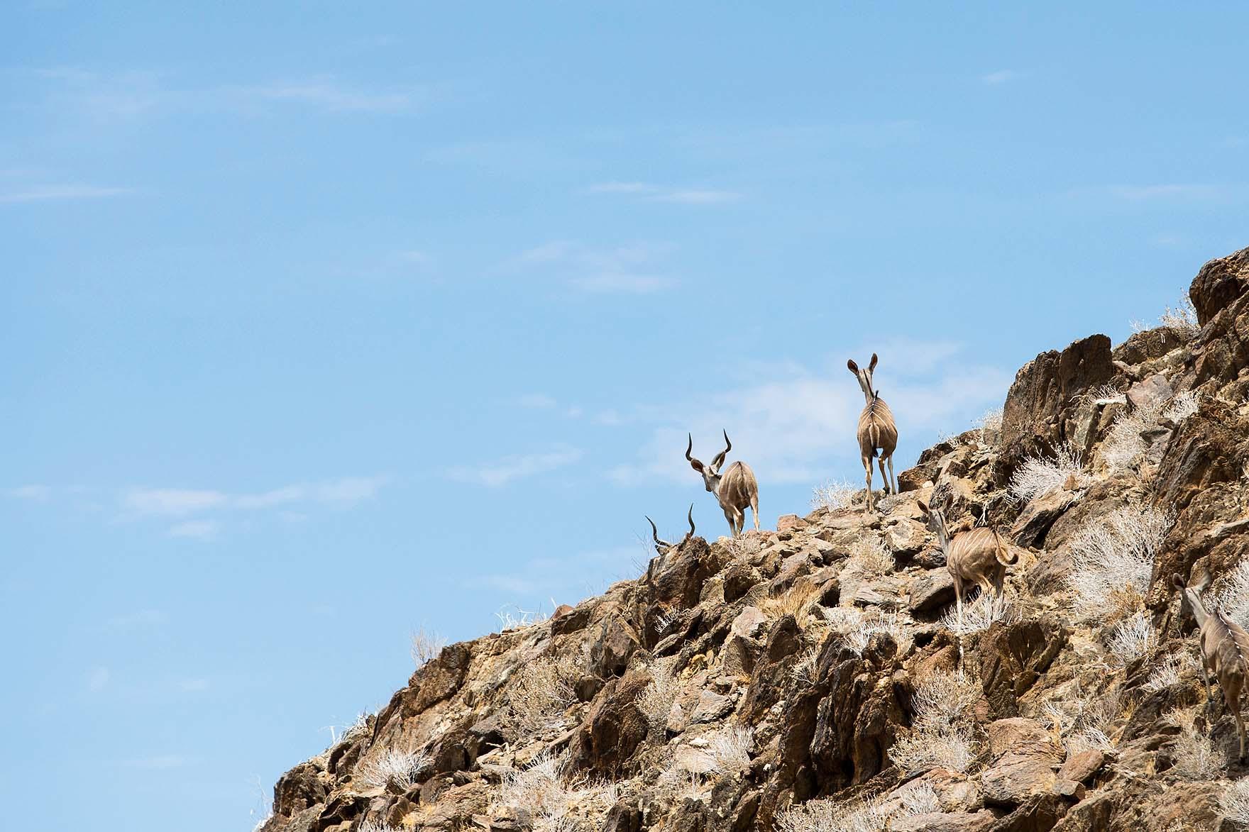 За четыре часа мы удалились на несколько десятков километров от океана и вторглись во владения пустыни Намиб. Вокруг, кажется, ни души. Только слоеные скальные отвесы, бывшие миллионы лет назад морским дном – рыжие, бурые и угольного цвета камни вулканической породы. Раскаленное царство простирается до горизонта.