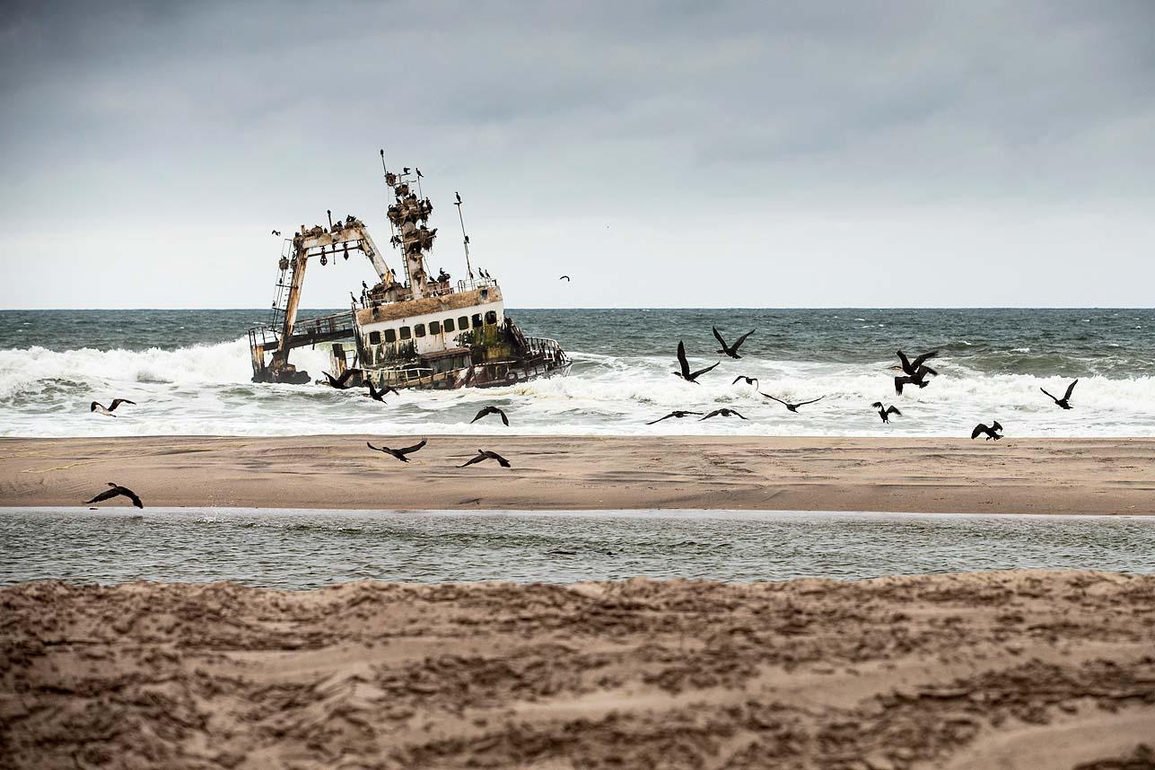 Сильно нагружать организм после перелета из зимы в лето, на противоположный край Земли, не рекомендуется. Мы и не стали. Привыкая к левостороннему движению прокатились в неспешном темпе вдоль западного атлантического побережья с романтическо-пиратским именем «Берег скелетов». Ни морских разбойников, ни останков китов, некогда давших название этому месту, мы не повстречали, зато полюбовались стайками фламинго и живописными песчаными дюнами. Красота! То тут, то там попадались нам и белые рукотворные горки соли. Здесь ее выпаривают из морской воды, да в таких огромных количествах, что часть идет на строительство дорог. Технология простая – ровное грунтовое полотно проливают концентрированным соляным раствором. На жаре состав каменеет и превращается в качественную дорогу, выдерживающую и тяжелые грузовики. Покрытие выглядит как асфальт и в сухую погоду обеспечивает похожие сцепные свойства, а дожди здесь редкость.