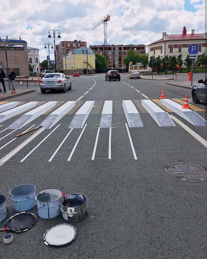 В КАЗАНИ прошел неудачный, а быть может наоборот – удачный, это как посмотреть, эксперимент с дорожной разметкой. Нарисованный недалеко от Казанского кремля пешеходный переход прожил всего один день. Дело в том, что рисунок был трехмерным – как нынче принято говорить, 3D. Его авторам удалось с помощью изобразительных методов создать на плоскости видимость целого ряда бетонных блоков. Идея в том, чтобы лихачи сбрасывали скорость. Однако местные пользователи соцсетей придумку не оценили и вынесли свой вердикт: «Дорога – не место для художеств. Люди будут резко тормозить, а это аварии». Властям такая аргументация показалась резонной, и уже через день 3D-«зебру» закрасили.