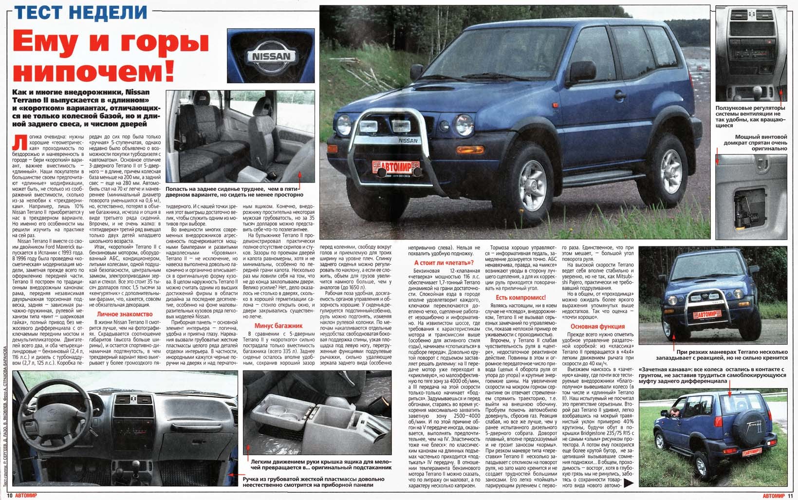 «Terrano II построен по традиционным внедорожным канонам: рама, передняя независимая двухрычажная торсионная подвеска, задняя – зависимая рычажно-пружинная; рулевой механизм типа «винт – шариковая гайка»; полный привод без межосевого дифференциала с отключаемым передним мостом и демультипликатором».