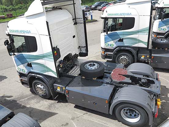 Газовые тягачи Scania CNG G340 предназначены для перевозок в составе еврофур. Их двигатель соответствует стандартам «Евро-6» и развивает 340 л.с. и 1600 Нм крутящего момента. Сжатый природный газ размещается в восьми стальных баллонах по 103 л каждый. В сумме это 824 л, которые обеспечивают запас хода не менее 600 километров. Причем баллоны расположены не за кабиной, а на раме, с обеих сторон, – на традиционных местах топливных баков. Такое решение позволило инженерам снизить центр тяжести автомобиля и не увеличивать его колесную базу. Запас газа контролируется на щитке приборов – обычным указателем уровня топлива.