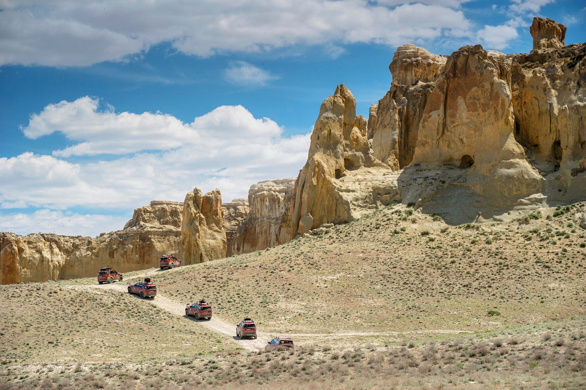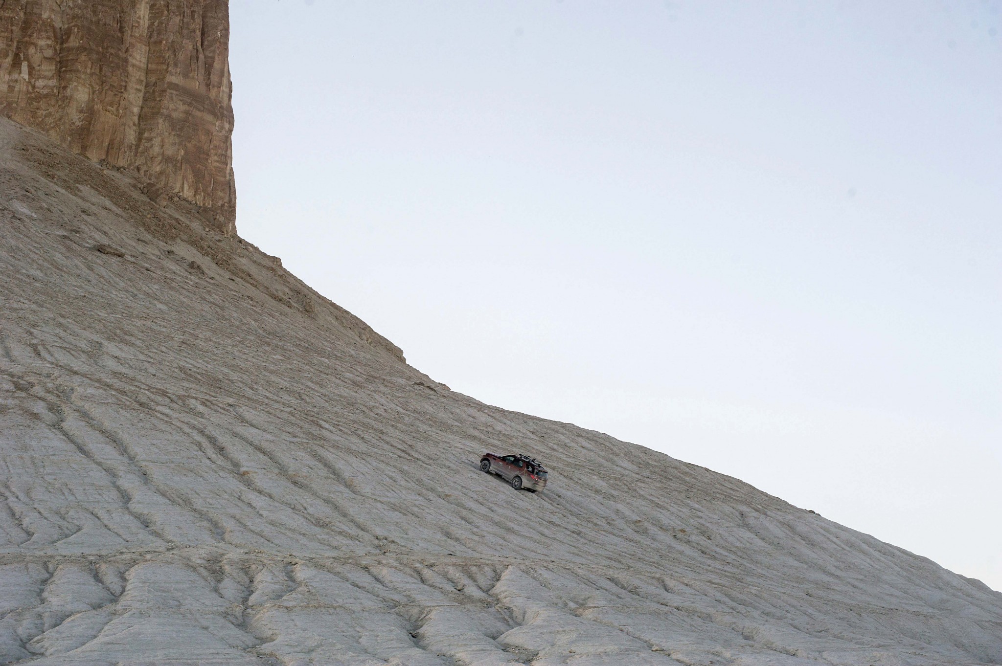 Сказать, что дорожные условия во время экспедиции были сложными – ничего не сказать. Особенно тяжко внедорожникам и их водителям пришлось на плато Устюрт, где песок и ровные площадки чередовались с заваленными разнокалиберными камнями участками и крутыми подъемами. В такой ситуации полный привод, пневмоподвеска и электронные ассистенты из приятных дополнений превращаются в необходимость. Например, взобраться к подножью «клыков Босжиры» удалось с помощью системы контролируемого движения под уклон Hill Descent Control. Функция All-Terrain Progress Control помогала при движении по каменистым участкам. Это своего рода внедорожный круиз-контроль, который позволяет водителю не отвлекаться на работу с педалями тормоза и акселератора, сосредоточившись на рулежке. Во всей красе показал себя полный привод Discovery: ни одна из машин на маршруте серьезно не застряла, помощь со стороны звать не пришлось. Сохранились в целости и бамперы с порогами – это заслуга внушительного клиренса и пневмоподвески, которая почти всегда находилась в верхнем положении.