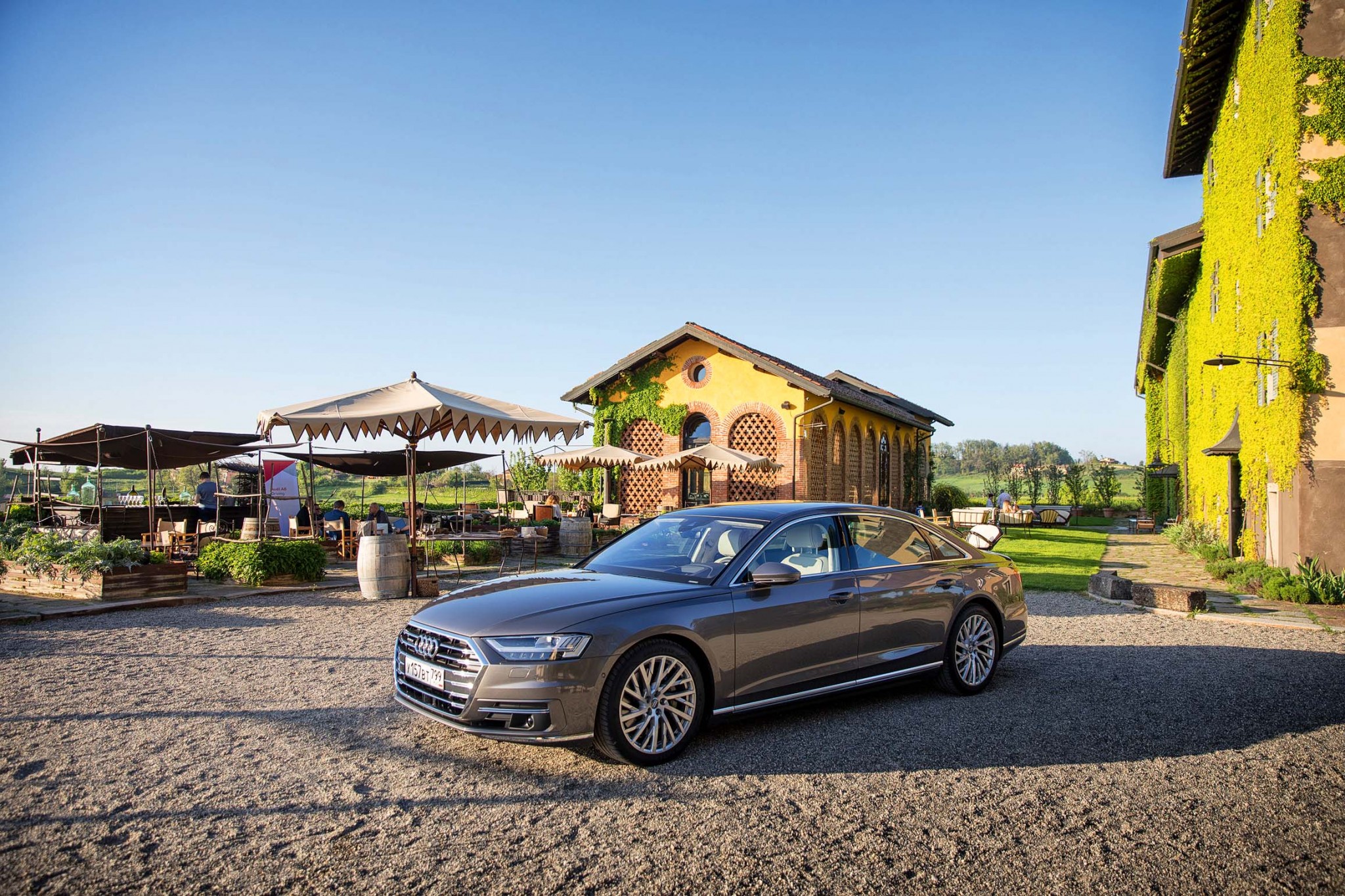 От миланского аэропорта до первой точки нашего путешествия, виллы Спарина, отправляемся на новом Audi A8. И эти первые 150 км пути – уже как детокс от будней, суеты и проблем. Кресла, обитые кожей тончайшей выделки, с функцией массажа убаюкивают. Чистота и выверенная простота линий в интерьере благодатно действует на глаза. Воздух, пропущенный сквозь систему очистки и ионизации, заставляет вновь дышать полной грудью. Но главное – это пейзажи за окном: изумрудные поля, самобытные деревеньки, виноградники.