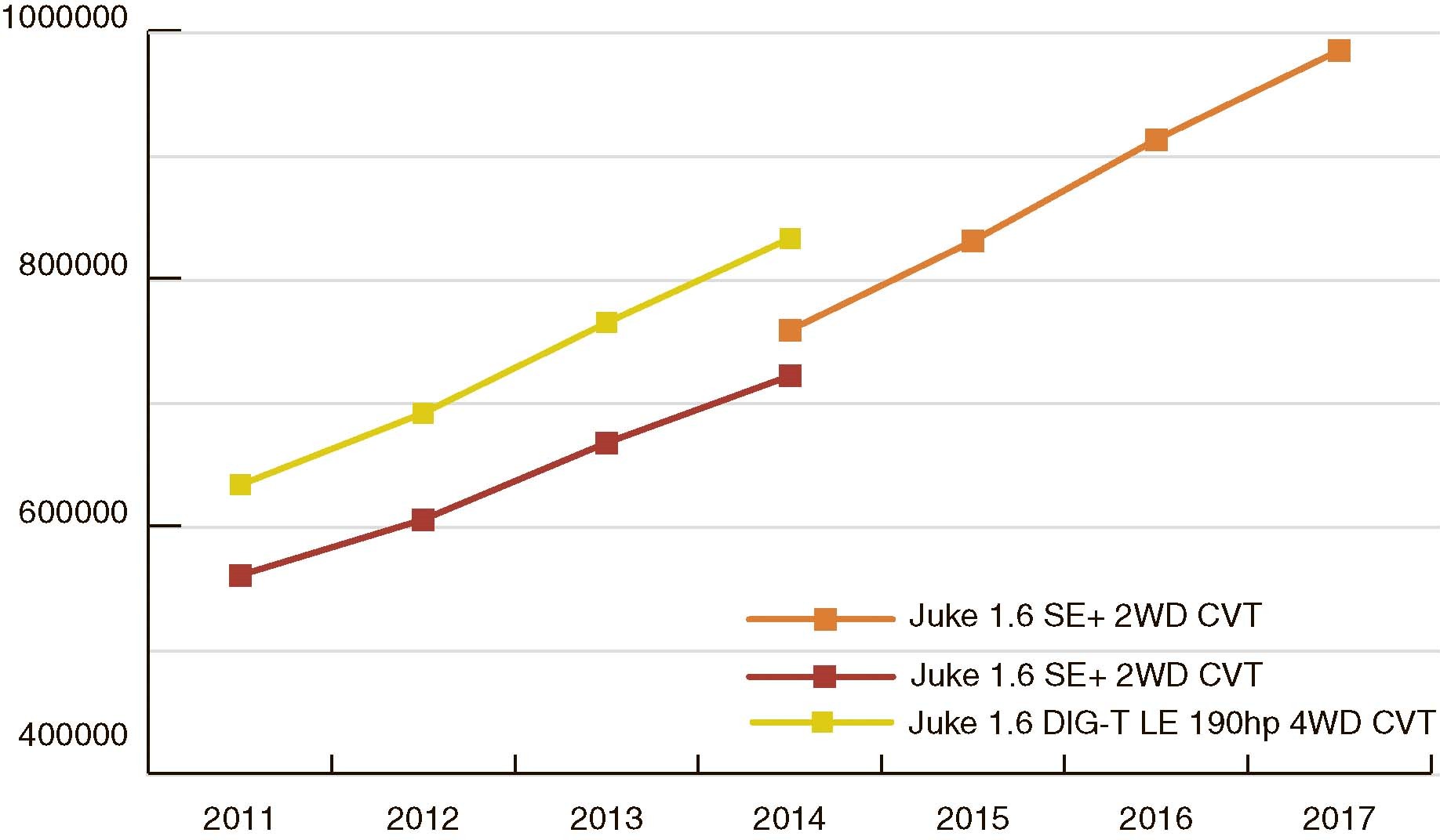 Зато двигатели в целом надежны. Их на Juke три и все бензиновые объемом 1,6 л мощностью 94, 117 и 190 «сил». Базовый 94-сильный прост и неприхотлив, а в содержании надежен и недорог. Правда, на рынке преобладают 117-сильные (HR16DE) модификации и турбо-версии. На этих моторах к сотне тысяч км растягивается цепь ГРМ. И тогда мотор плохо заводится, «тупит» и в один прекрасный момент просто «умирает» – сработает датчик положения распредвала. Одновременно сдается задняя опора двигателя (от 4000 руб.). Остальные выдерживают дольше, правда, и стоят дороже.