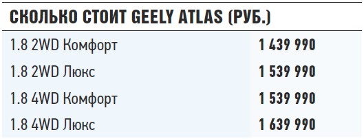 Объявлены цены флагманского кроссовера Atlas с турбодвигателем 1.8. Он на 35 л.с. мощнее атмосферного агрегата 2.4, предлагавшегося для модели Atlas ранее, и автомобиль с таким мотором обойдется минимум в 1 439 990 рублей. Столько попросят за модификацию «Комфорт» с АКП, всеми доступными для Atlas системами безопасности, бесключевым доступом, медиацентром с сенсорным дисплеем. Также двигателем 1.8 может быть оснащена модификация «Люкс» с двухзонным климат-контролем, штатным навигатором, электрорегулировками сидений, камерой кругового обзора, кожаной отделкой. Цена – от 1 539 990 рублей.