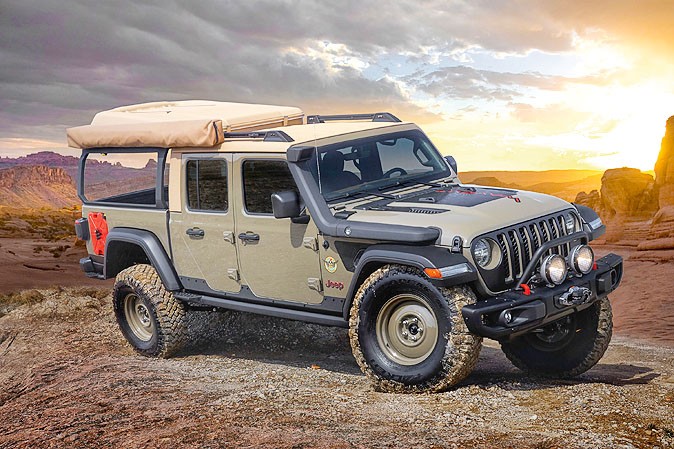 JEEP СОВМЕСТНО С MOPAR подготовил шесть концептов для ежегодного пасхального сафари в Моабе. Среди них – Jeep Wayout со складной палаткой на крыше, построенный на базе нового пикапа Gladiator. Автомобилю достались также два топливных бака, лифткомплект и 37-дюймовые шины.