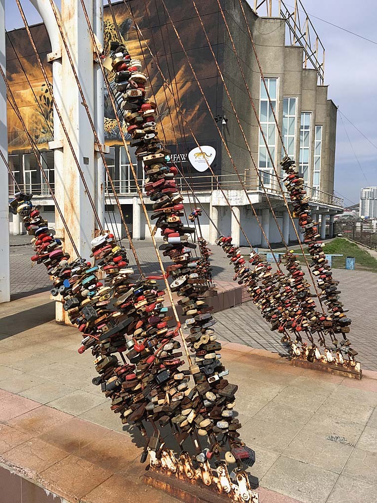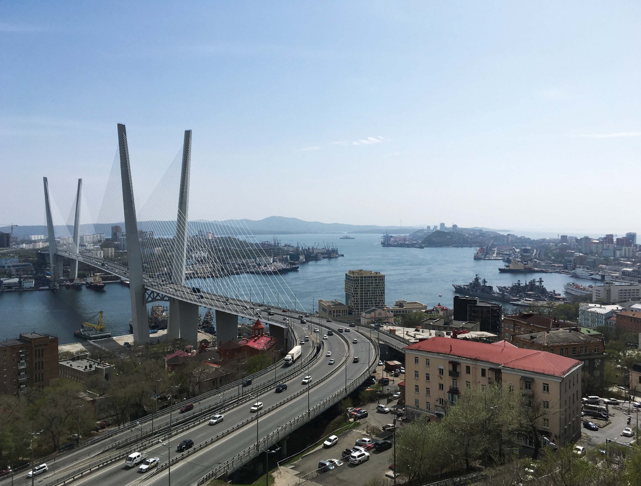 Вид со смотровой площадки потрясающий, ради такого и по кочкам попрыгать не жалко. Главный элемент пейзажа – вантовый мост через бухту «Золотой рог», который пытались построить еще в начале XX века, но открыли только в 2012 году. Некоторые невнимательные туристы считают, что именно он изображен на купюре достоинством в 2000 рублей, но это не так – на банкноте запечатлен мост на остров Русский. Он тоже вантовый, но выглядит по-другому и находится чуть дальше. Естественно, мы не могли упустить возможность проехать по нему, но для этого нужно было спуститься вниз.