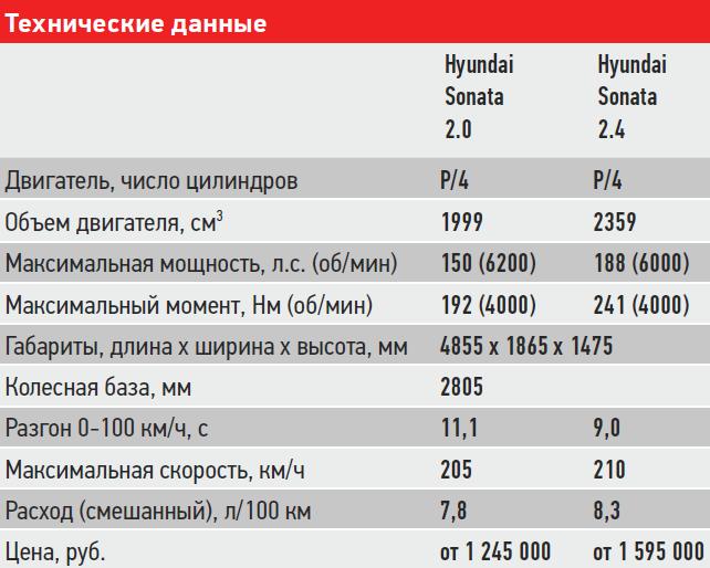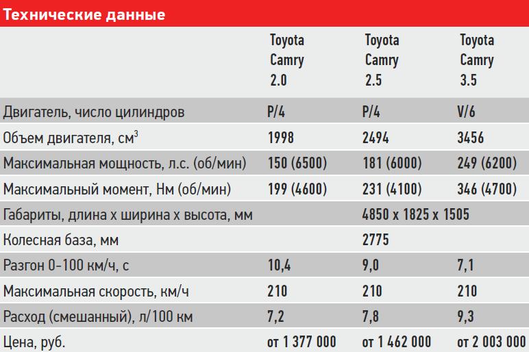 Чем же ответит Toyota? Оказывается, в ее запасе много весомых аргументов. На сегодняшний день японский седан предлагает российским покупателям три, работающих в паре с 6-диапазонной АКП, мотора: 2,0 (150 л.с.), 2,5 (181 л.с.) и 3,5 (249 л.с.) и девять комплектаций. И если мы решим выбрать из этого разнообразия что-то близкое по содержанию к «Сонате» в оснащении Style, то обнаружим, что заданным критериям поиска соответствует Camry в исполнении «Стандарт Плюс». При этом японское предложение на 15 тысяч рублей дешевле.