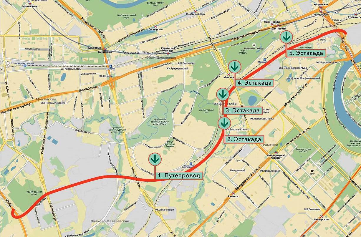 Протяженность Южного дублера Кутузовского проспекта в Москве составит 11,5 км, на которых возведут восемь путепроводов, включая две крупные разворотные эстакады и четыре моста через реку Сетунь. Об этом журналистам поведал глава столичного департамента строительства Андрей Бочкарев. Изначально трассу планировали строить с привлечением средств инвесторов и делать ее платной. Однако потом, что называется, концепция изменилась – правительство города запустило руку в столичный бюджет. А это значит, что дорога, которая пройдет по территории промзоны «Очаково» вдоль Киевского направления МЖД через Очаково-Матвеевское, Раменки, Фили-Давыдково и Дорогомилово, будет бесплатной!