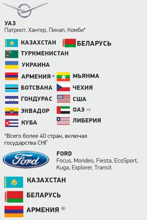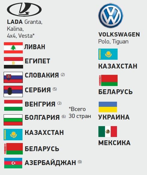 Так, в июне 2017 года компания Renault начала поставки автомобилей Duster в страны Совета сотрудничества арабских государств Персидского залива (Саудовская Аравия, Объединенные Арабские Эмираты, Катар, Оман, Кувейт и Бахрейн). Налажен экспорт в государства Ближнего Востока и Африки, такие как Ливан и Египет. На рынках этих стран продаются автомобили марок Hyundai, Datsun и Lada российской сборки. А география экспорта продукции «АвтоВАЗа» впечатляет еще больше – автомобили Lada поставляются в 30 разных государств.