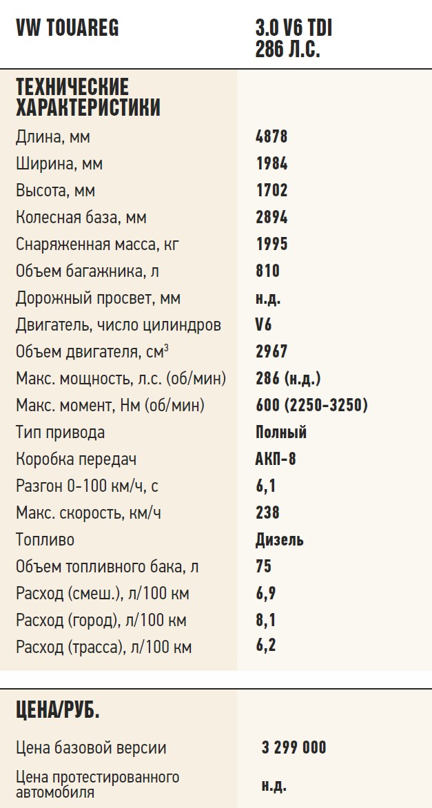 Разработчики Volkswagen утверждают, что да. Новому «Туарегу» оставили полный привод 4MOTION с самоблокирующимся межосевым дифференциалом, асимметрично распределяющим момент по осям: до 70% на переднюю и до 80% – на заднюю. При этом возможность выбрать внедорожные режимы движения все же оставили. Так что с разбитой или размытой дождями проселочной дорогой у Touareg проблем не возникнет. Тем более, что сомневающиеся в проходимости кроссовера могут заказать опционную пневматическую подвеску. В режиме Special off-road дорожный просвет можно увеличить на дополнительные 70 мм. А глубина преодолеваемого брода теперь не 490, а 570 мм. Неплохо же!