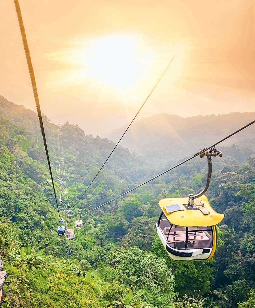 - ГЕНТИНГ. МАЛАЙЗИЙСКИЙ «ЛАС-ВЕГАС» – город Гентинг – раскинулся на высоте 2 000 м. И канатка – самый приятный способ попасть туда, не садясь за руль. Длина трассы, которая до недавних пор считалась самой скоростной в мире, составляет 3 380 м. Восьмиместные гондолы мчатся над джунглями со скоростью 21,6 км/ч (6 м/с), а время подъема составляет всего 11 минут. Дорога введена в строй в 1997 году, а стоимость проезда туда-обратно – всего $3.