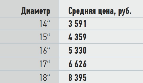Дешевле всего стоят 14-дюймовые шины (3 591 рубль в среднем за покрышку), на втором месте по доступности – резина 15“ (4 359 рублей), а замыкают тройку самые популярные у покупателей 16-дюймовые шины, средняя цена которых 5 330 рублей за штуку. Самыми дорогими ожидаемо оказались 18-дюймовые покрышки – 8 395 рублей за единицу.