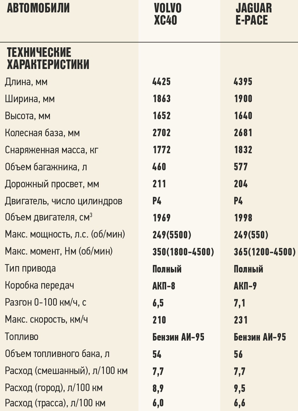 Почти год назад мы уже устраивали поединок с участием E-Pace. Несмотря на очень серьезного соперника из Audi, «британец» эмблемы своей не посрамил. Возможно, именно это вселило в него дополнительную уверенность. Так или иначе, с момента нашей первой встречи автомобиль подорожал процентов на десять. Нынешние цены на младшего из кроссоверов Jaguar начинаются с 2 729 000 рублей за базовую модификацию со 150-сильным дизелем и заканчиваются на рубеже в 4 117 000 рублей за топовый бензиновый вариант мощностью 300 л.с. Между ними укладываются еще две дизельные версии с отдачей 180 и 240 л.с. и пара, развивающих на бензине 200 и 249 л.с.