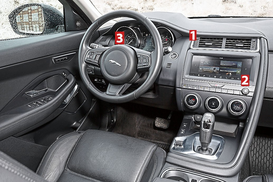 По паспортным данным грузовой отсек «Ягуара» вместительнее, но наши измерения показали обратное. Не менее очевидно отсутствие в багажнике «британца» дополнительных отделений. Диван тоже не самый просторный. За водителем ростом 185 мм столь же высокий пассажир упрется своими коленями в спинку переднего кресла. И хотя на заднем торце центрального бокса гнездятся аж три USB-разъема, обогрева дивана в E-Pace не предусмотрено.