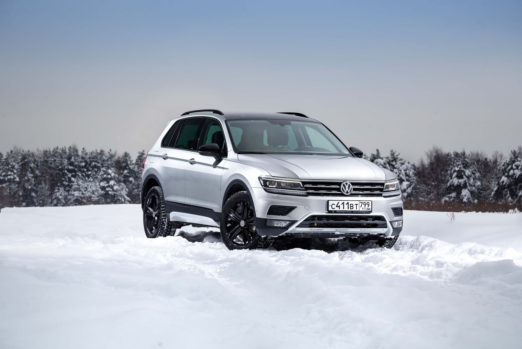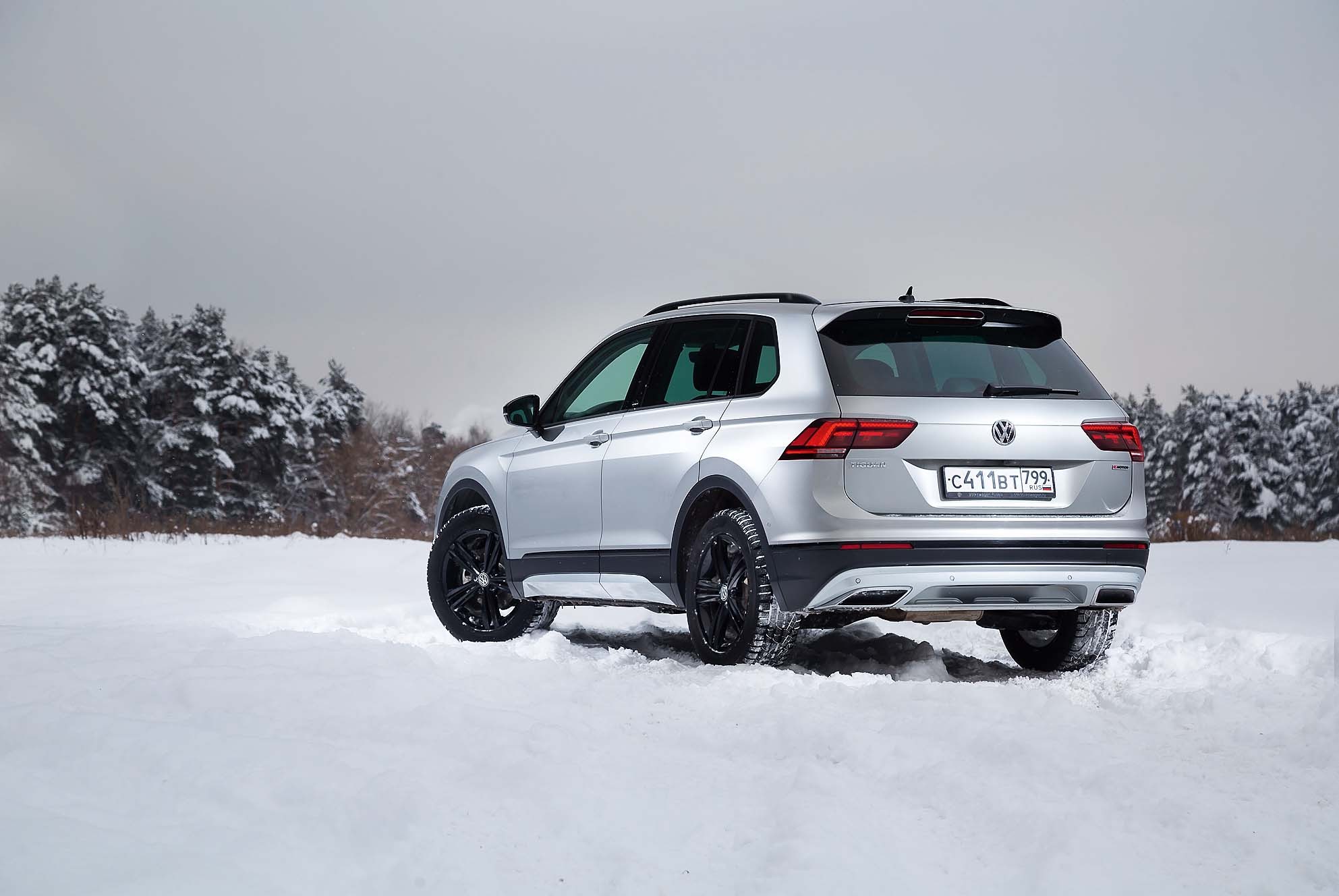 Стройные «припудренные» елочки – замечательная массовка для красивой картинки. Однако подобраться к ним оказалось непростой задачкой. Осадков в первой половине января выпало изрядно, а фрикционные шины Pirelli Sottozero хоть и хороши на «каше», явно не предназначены для рубки колеи в глубоком насте. Но шильдик Offroad как бы обязывает, а фотограф настойчиво требует, и, предварительно выбрав на селекторе трансмиссии пиктограмму со снежинкой, я направляю Tiguan в белое поле.