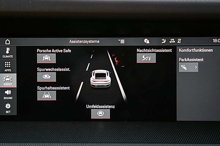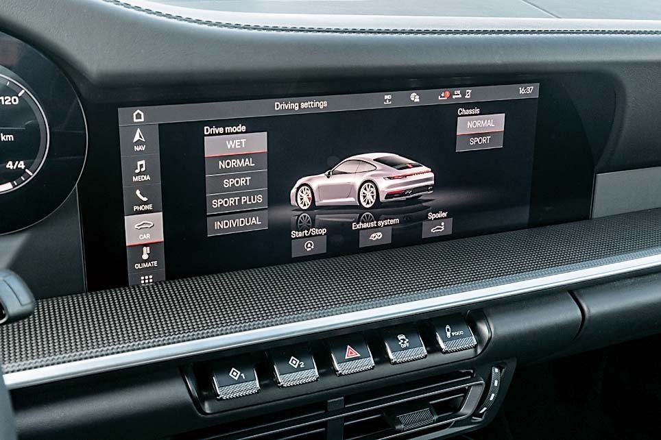 Впрочем, знания и умения Porsche 911 уже давно вышли за рамки области двигательных функций, и у спорткара нового поколения простираются еще шире. Думаю, что удивить покупателя дорогого автомобиля приборами ночного видения, даже с дальнобойностью в три сотни метров, сложновато, посему подробнее остановлюсь на другом, не виданном ранее ассистенте Wet Mode.