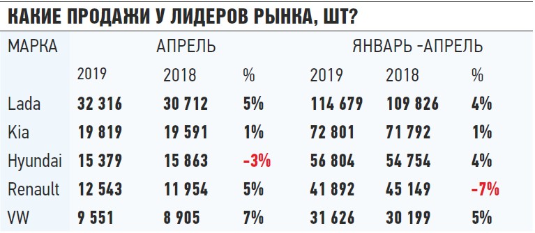 Самое большое падение у коммерческих Mercedes-Benz – минус 77 процентов. Также большое падение продемонстрировали Honda (-66%), Lifan (-62%), Nissan (-55%), Fiat (-49%). Как и месяцем ранее, верхние десять строчек продаж занимают автомобили российского производства. Лидер по итогам апреля – Lada Granta с результатом 12 652 реализованных автомобиля. Практически все пять лидеров рынка показали по итогам апреля небольшой рост. Lada прибавила 5 процентов, Renault – 5 процентов, Volkswagen – 7 процентов, Kia – всего 1 процент, а вот продажи Hyundai сократились в прошлом месяце на 3 процента по сравнению с тем же периодом прошлого года. При этом по итогам первых четырех месяцев 2019 года у Hyundai рост – плюс 4 процента.