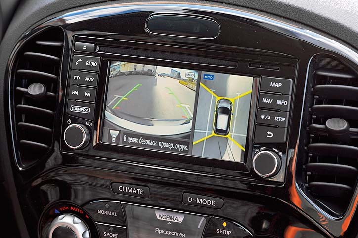 КАМЕРЫ КРУГОВОГО ОБЗОРА – весьма полезная «фишка» Nissan Juke. Но графика экрана и быстродейтвие мультимедийной системы оставляют желать лучшего.
