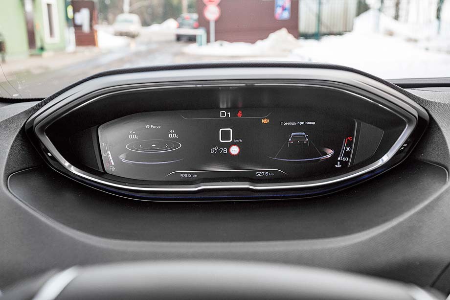 Монитор вместо щитка приборов – это привычная для многих автокомпаний практика. В Peugeot такую «приборку» назвали i-Cockpit. На экран можно вывести самую разную информацию, в том числе и величину перегрузок при ускорении