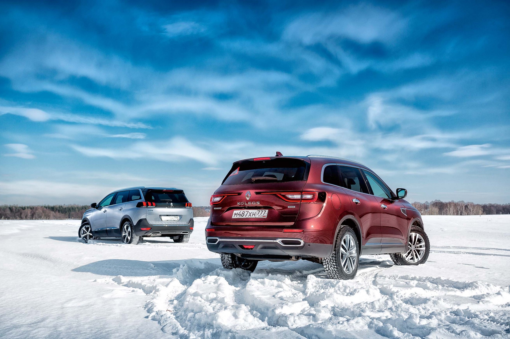 Оба автомобиля дизельные, но у них есть одно существенное различие – 5008 по умолчанию оснащается только передним приводом, Koleos же независимо от комплектации предлагается с четырьмя ведущими колесами. Поэтому вне асфальта преимущество, конечно же, на стороне Renault. Это доказала безобидная на вид колея, по которой полноприводный «француз» прополз, даже не замедляя ход, а следовавший позади 5008 почти сразу «закопался» и уперся в снег днищем. Но как так? Ведь «по паспорту» дорожный просвет у него больше, чем у Koleos? Оказывается, что заявленные 230 мм – это расстояние от земли до порогов. Пространства под передним бампером намного меньше, примерно 160 мм. Заявленный дорожный просвет Renault – 210 мм. Но даже не это должно отвратить водителя 5008 от бездорожья, а передний привод, пусть и дополненный электронными помощниками в топовых комплектациях. Для улучшения сцепления с покрытием в сложных дорожных условиях у Peugeot есть система Advanced Grip Control. С помощью шайбы на центральном тоннеле можно выбрать один из алгоритмов движения (варианты привычные – снег, грязь, песок и т.д.). Электроника управляет крутящим моментом в зависимости от того, какое колесо начинает проскальзывать, но толку от этого немного – полный привод такая система заменить, конечно, не сможет. На дачу по «грунтовке» и укатанному снегу 5008 довезет, но каких-то более сложных маршрутов этому городскому жителю лучше не предлагать.