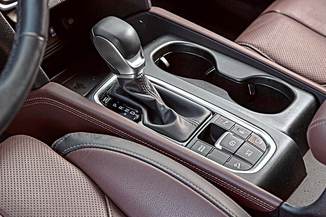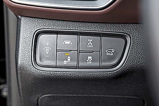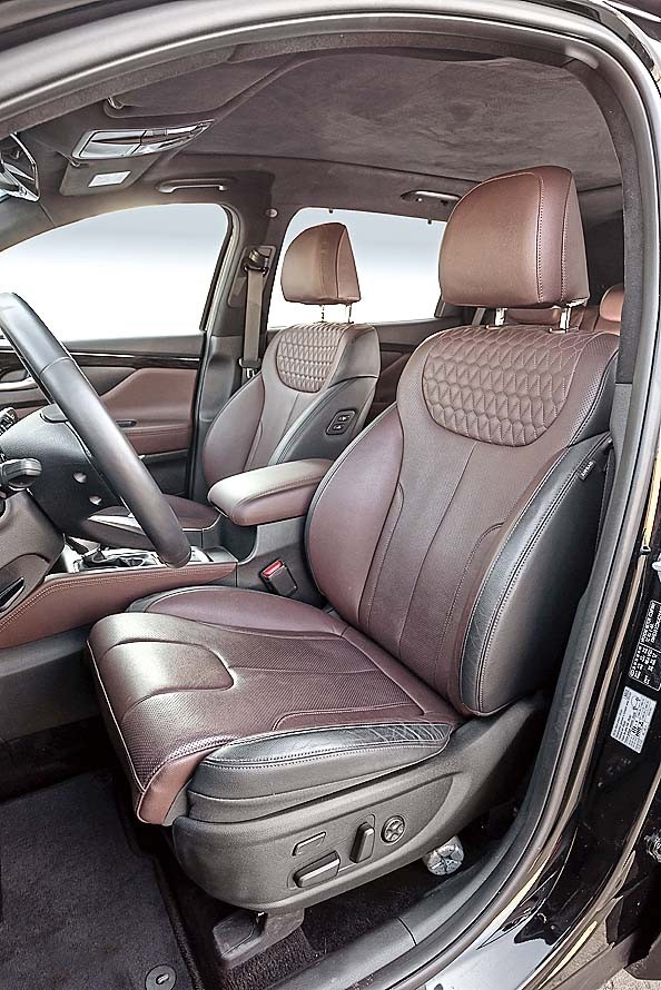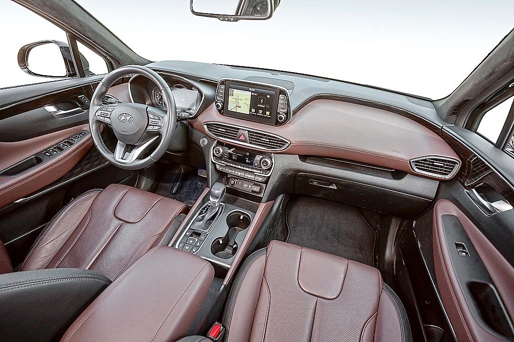 В целом же Renault Koleos в максимальной комплектации производит впечатление автомобиля вполне просторного и комфортного, но без излишней роскоши. К примеру, креслу водителя, снабженному минимальным набором электрорегулировок, остро не хватает настройки наклона подушки – было бы не лишним поднять ее передний край повыше. На выбор предоставляется несколько вариантов оформления цифровой комбинации приборов – выбрать один из них можно, основательно закопавшись в закоулках главного меню. Хорошо, что подогрев сидений и основные функции климат-контроля можно включить обычными, осязаемыми клавишами и «крутилками». Салон Hyundai Santa Fe – по крайней мере в дорогой версии Black&Brown – выглядит куда более роскошным. Многослойная архитектура передней панели, широкий центральный тоннель, ниша для зарядки смартфонов под полноценным блоком «климата» – все работает на создание монументального образа.