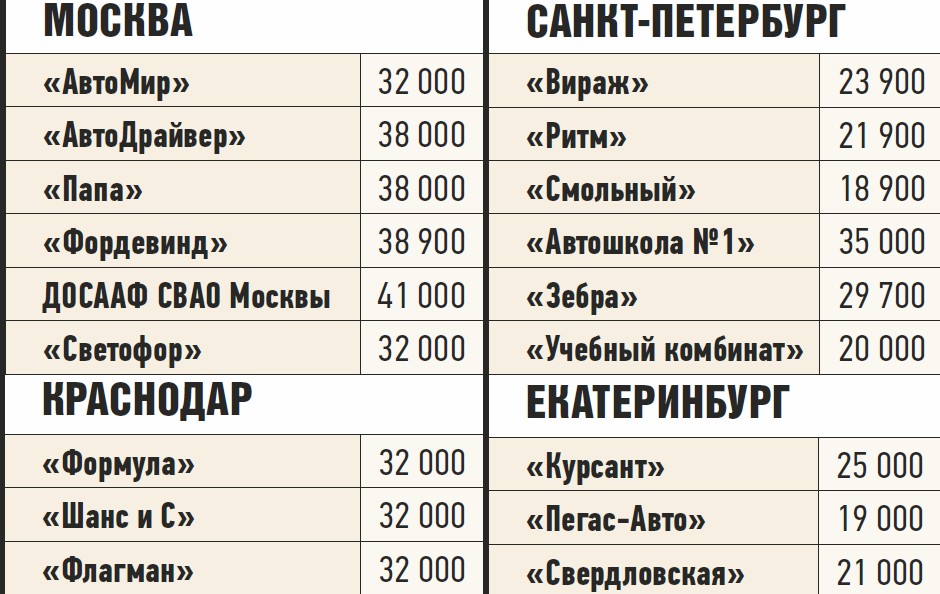 В 2019 году обучение в автошколе в среднем стоит около 30 тысяч рублей. В таблице собраны цены из нескольких городов для автомобилей с МКП в расчете на 56 часов без скидки.